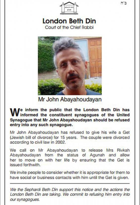 It is the first time in ten years that the Beth Din has publicly named and shamed a member of the community for refusing a get. Naming and shaming is considered a last resort in a dispute over granting a get. Mr Abayahoudayan did not respond to attempts by The Independent to contact him.