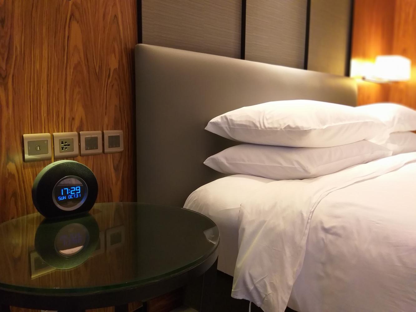 Opposite my king-sized bed was a 55-inch smart TV with approximately 40 satellite channels. A Bluetooth-enabled JBL sound system doubles as an alarm clock.