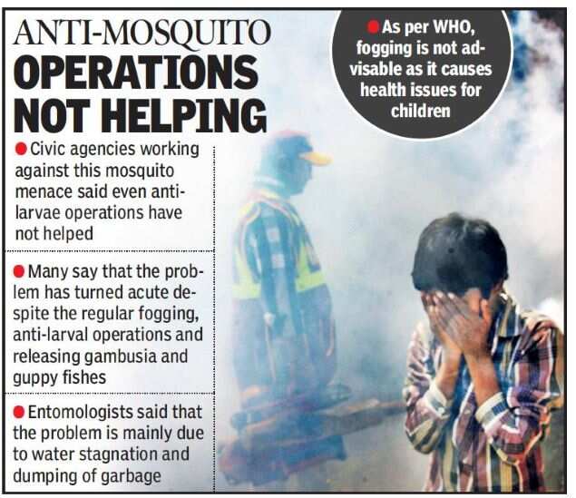 While some residents blame the civic authorities for not being able to control the menace, many also say that the problem has turned acute despite the regular fogging, anti-larval operations and releasing gambusia and guppy fishes into city water bodies to check breeding of mosquitoes.