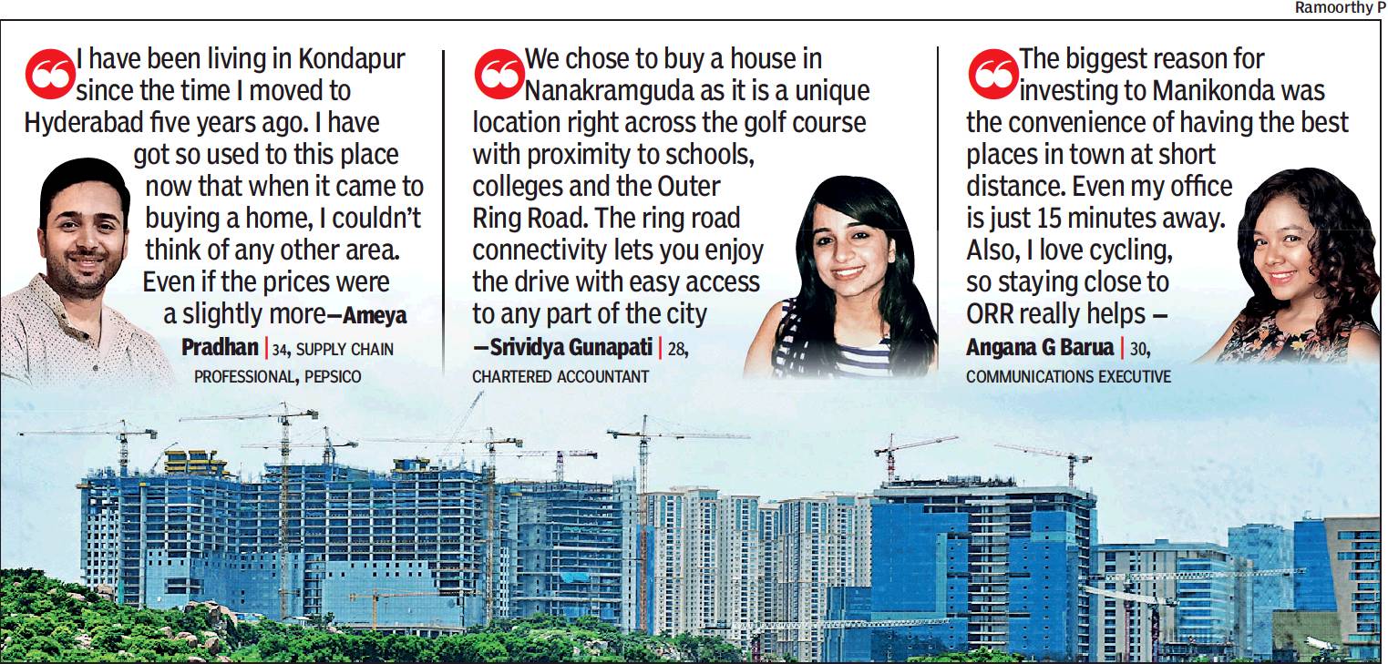 "When I initially moved to Hyderabad, I had bought a second-hand home in Begumpet because that was the epicentre. Now, with time, that's shifted to the western region and all our friends too have moved there. So, we decided to follow suit," said 34-year-old Priyank Tripati who recently bought a 2BHK in Nanakramguda. That commute to his office, in Somajiguda, has increased from 10 minutes to 45 minutes, isn't something the banker minds. Neither does Pravin Kumar, a marketing executive working out of an office in Ameerpet. He is waiting to move into his near-complete home in Financial District.