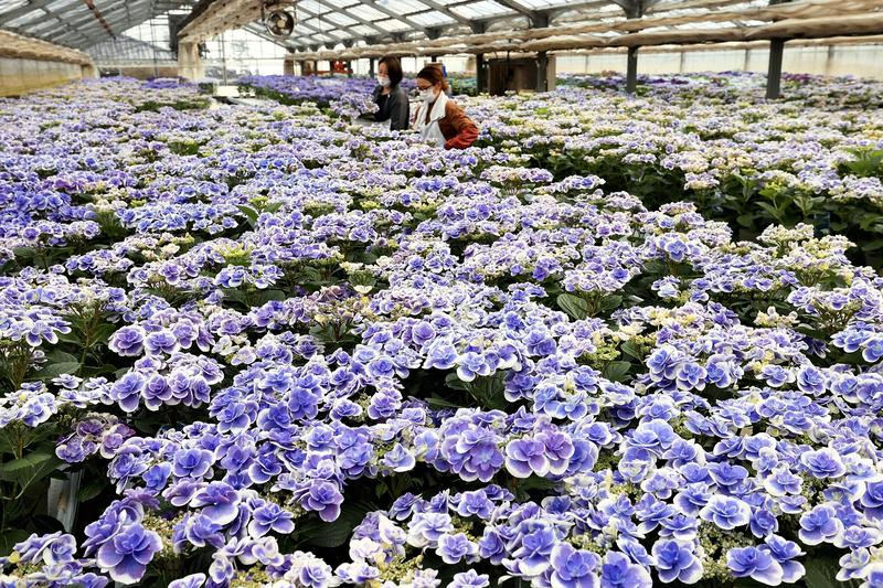 Shipments of potted hydrangeas at Sakamoto Gardening in Kiryu, Gunma Prefecture, have reached their peak prior to Mother's Day, which is on May 10. Sakamoto grows approximately 60 kinds of hydrangeas in its greenhouses. Recently, hydrangeas, along with carnations, have become popular as Mother's Day gifts. The company ships out about 25,000 hydrangeas to markets including Tokyo and Nagoya. The grower's second-generation owner, said, "I hope these hydrangeas can give someone a peaceful feeling in this difficult time."