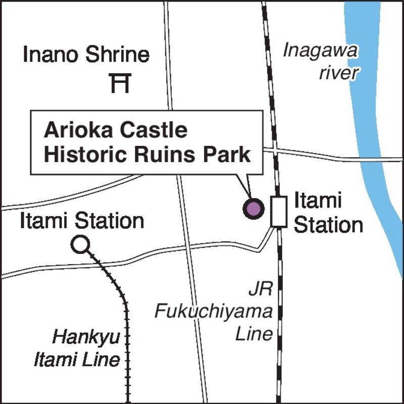 The Arioka Castle Historic Ruins Park is located in front of the west exit of Itami Station on JR Fukuchiyama Line. It is about a 10- to 15-minute walk to Inano Shrine from either JR Itami Station or Hankyu Itami Station.
