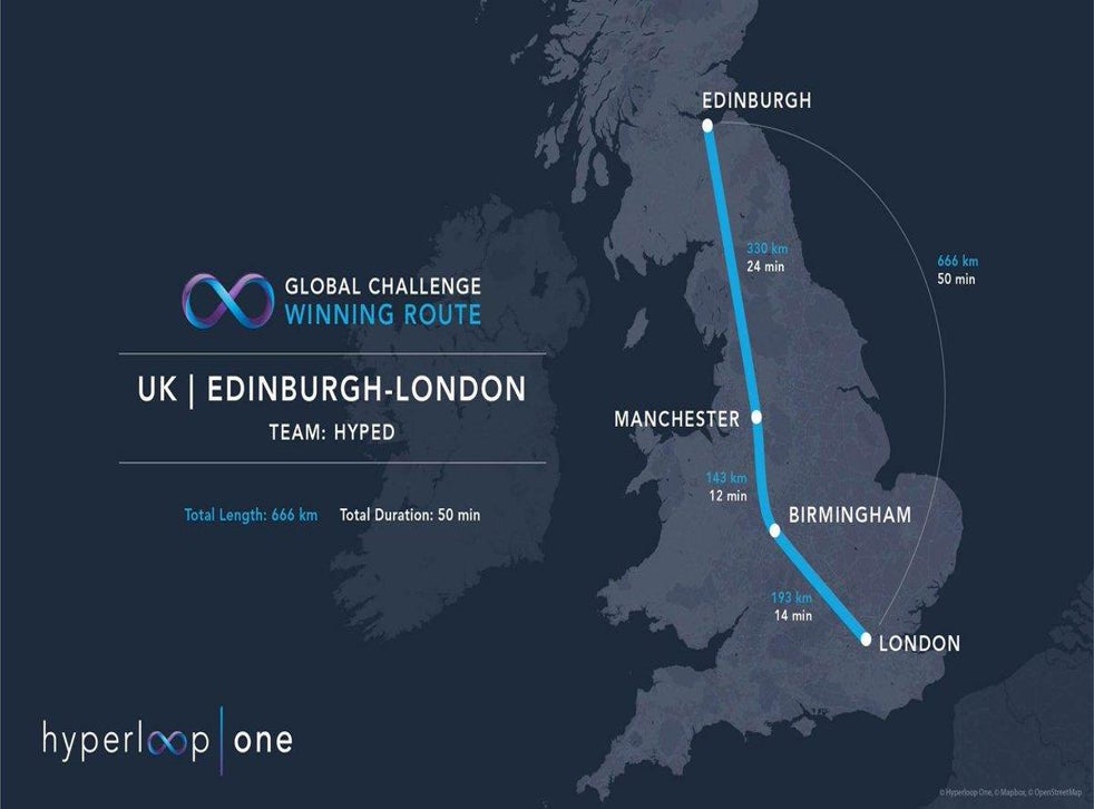Virgin Hyperloop has proposed a route between London and Edinburgh that passes through Birmingham and Manchester, with the entire journey taking less than an hour. The company, which was previously named Hyperloop One before Richard Branson invested in it, claims the UK route would be both quicker and cheaper than the high-speed HS2 rail network currently being developed.