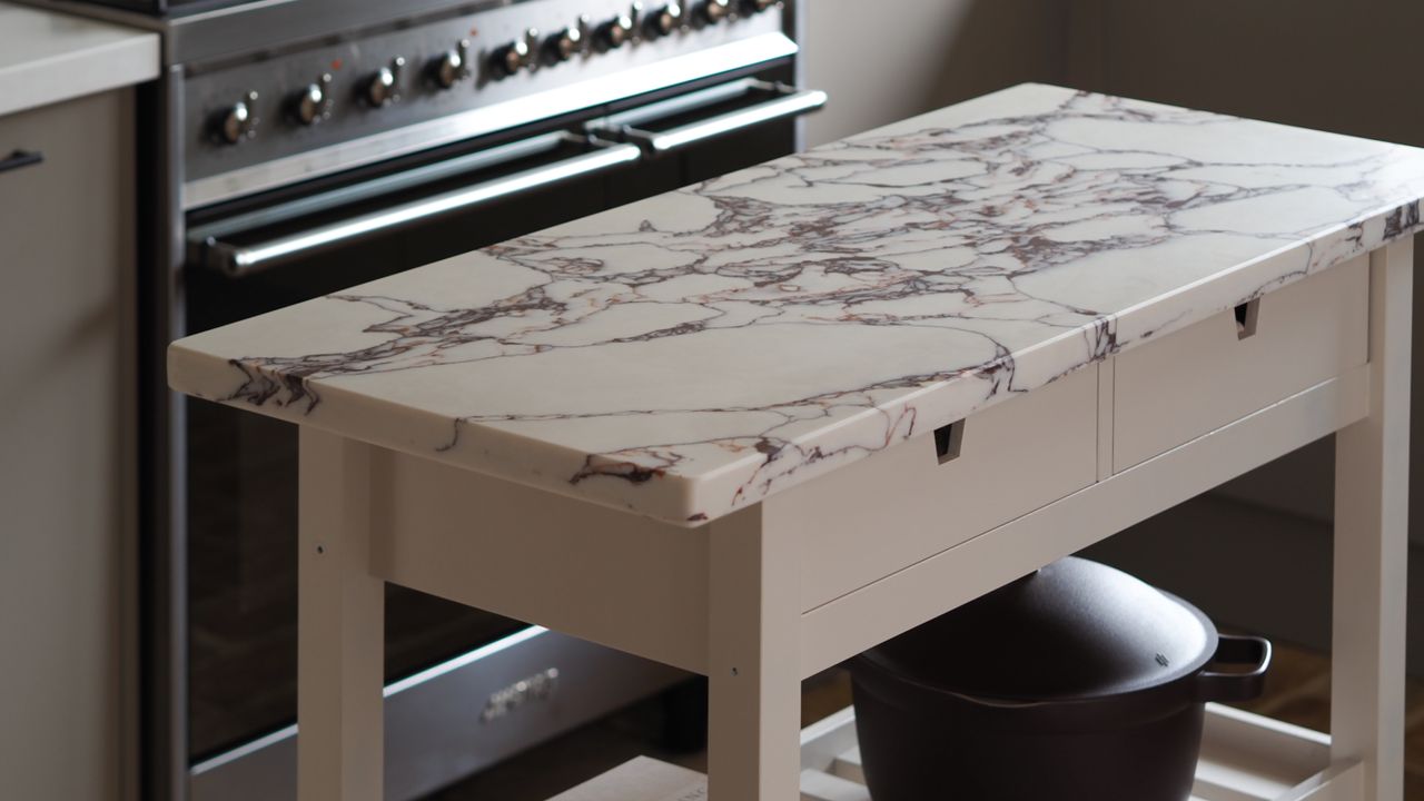 I'd always recommend getting to know your local stone yard — I've finished dozens of projects in my home this way, from my outdoor kitchen to shelving indoors and even a coffee table. Getting stone cut to size isn't prohibitively expensive, and for a project this size, you might even be able to find an offcut of stone that'll bring the price down. For my offcut of a marble-effect composite, I was charged £75, including cutting and profiling the edges.