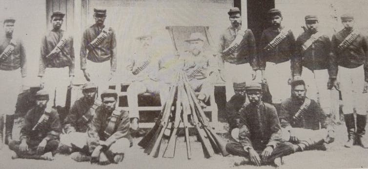 Queensland was a violent place, less a product of London than the other colonies. In 1867, the Port Denison Times advocated that for every white life lost “we take, say fifty”. The Native Police in the new colony were given a mission, headed by Commissioner David Seymour, who also ran the constabulary police for nearly 30 years. They were led by privileged white men who had little training, and were often fuelled by alcohol. They used Aboriginal men from distant communities, enticing them into service with money, guns, food and horses.
