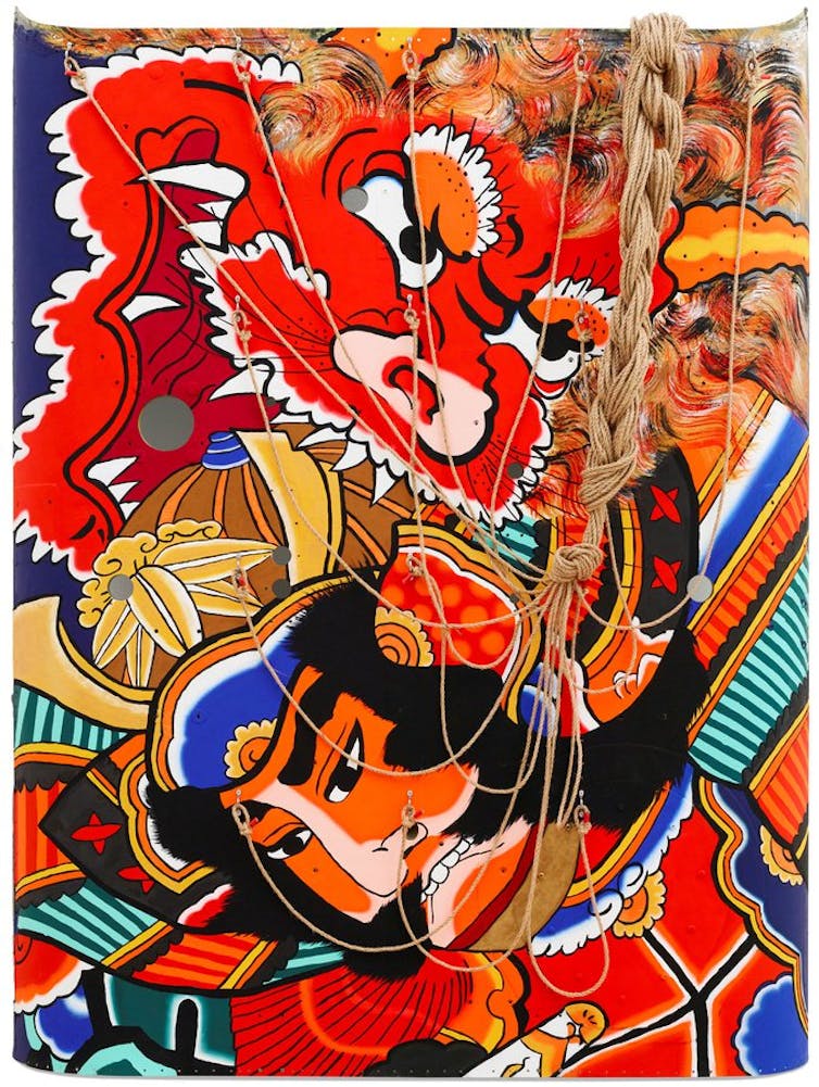 Raiko and Shuten-doji is painted on a piece of an army surplus helicopter, so that the Japanese legend of the warrior Raiko and the demon Shute-doji can be viewed through the lens of military conflict. But then they turn it back into a kite: a playful thing.