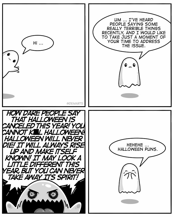 It was the dark days of the pandemic, lockdowns were still implemented in many places across the world, and people were already fearing the cancellation of Halloween that year. Halloween?! The best of the holidays… CANCELED?! NEVER! So Ghost was born to try to bring hope and a little clarity to the situation: OVER HIS… ummm… DEAD BODY!…? He was only meant to be here for a moment, but he never went away.