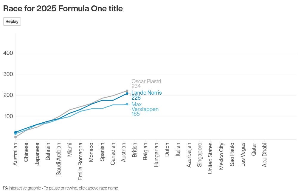The British driver was in tears on his in-lap, his voice cackling over the radio, before he left the McLaren which carried him to glory and shook hands with Verstappen and Piastri before hugging his mother, Cisca, and father, Adam, with his fluorescent crash helmet still on.