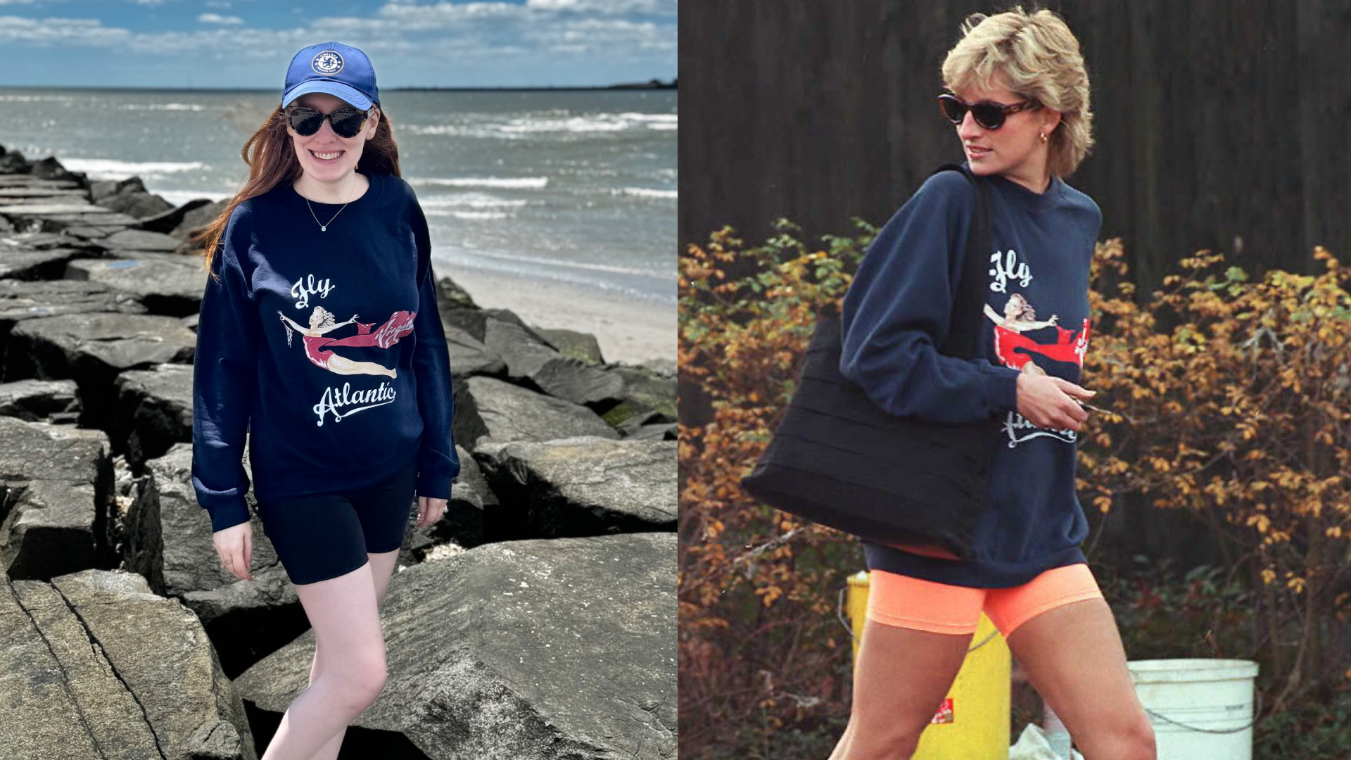 I've had this replica of Diana's Virgin Atlantic design for years, and although it was way too chilly to be wearing shorts at the beach on this particular day, I toughed it out for the project. Etsy is a fantastic source if you're looking for an exact copy of Di's Virgin Atlantic shirt, but the great thing about this combo is you can really pair any sweatshirt with bike shorts and get that royal feeling. For a bit of a Chelsea shout-out, I added my own beloved Chelsea FC cap. Even if Diana didn't publicly support a football team, I have a feeling she'd be one of The Blues.