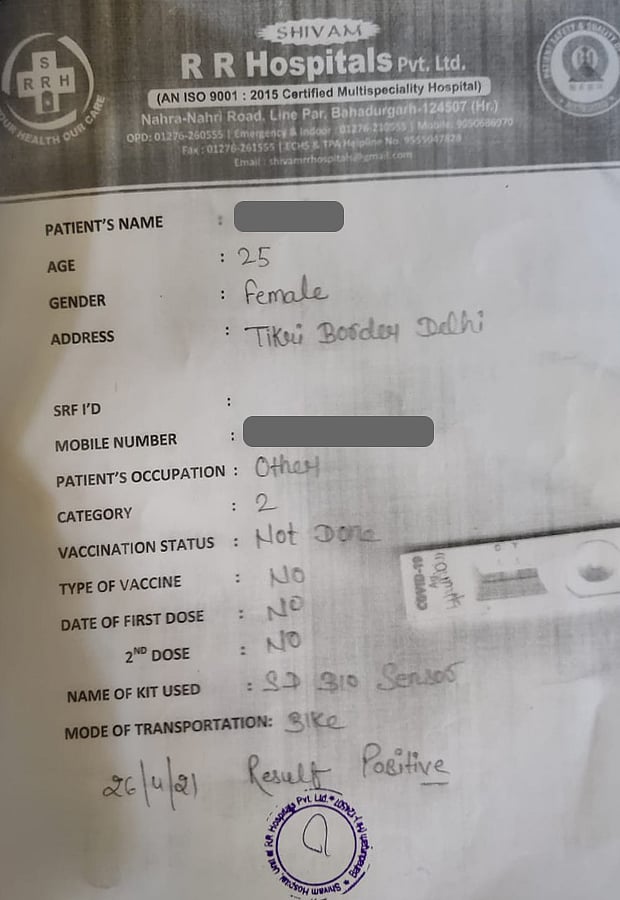 On April 26, Kavita took Namrata to Shivam RR Hospital in Bahadurgarh, around four km from the Tikri protest site. Namrata was admitted and Kavita returned to Tikri. She herself had some breathing difficulties, she added, but she did not get herself tested.