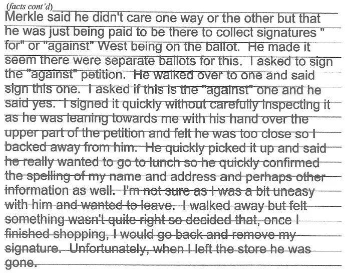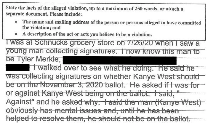In a separate complaint, one voter alleged that Merkle offered her a choice of petitions to sign. “He asked me if I was for or against Kanye West being on the ballot,” the 64-year-old St. Louis resident stated in her complaint. “He made it seem there were separate petitions for this. I asked to sign the ‘Against’ petition. He walked over to one and said sign this one. I asked if this is the ‘Against’ petition and he said ‘Yes.’ I signed it quickly without carefully inspecting it as he was leaning towards me with his hand over the upper part of the petition and [I] felt he was too close so I backed away from him.”