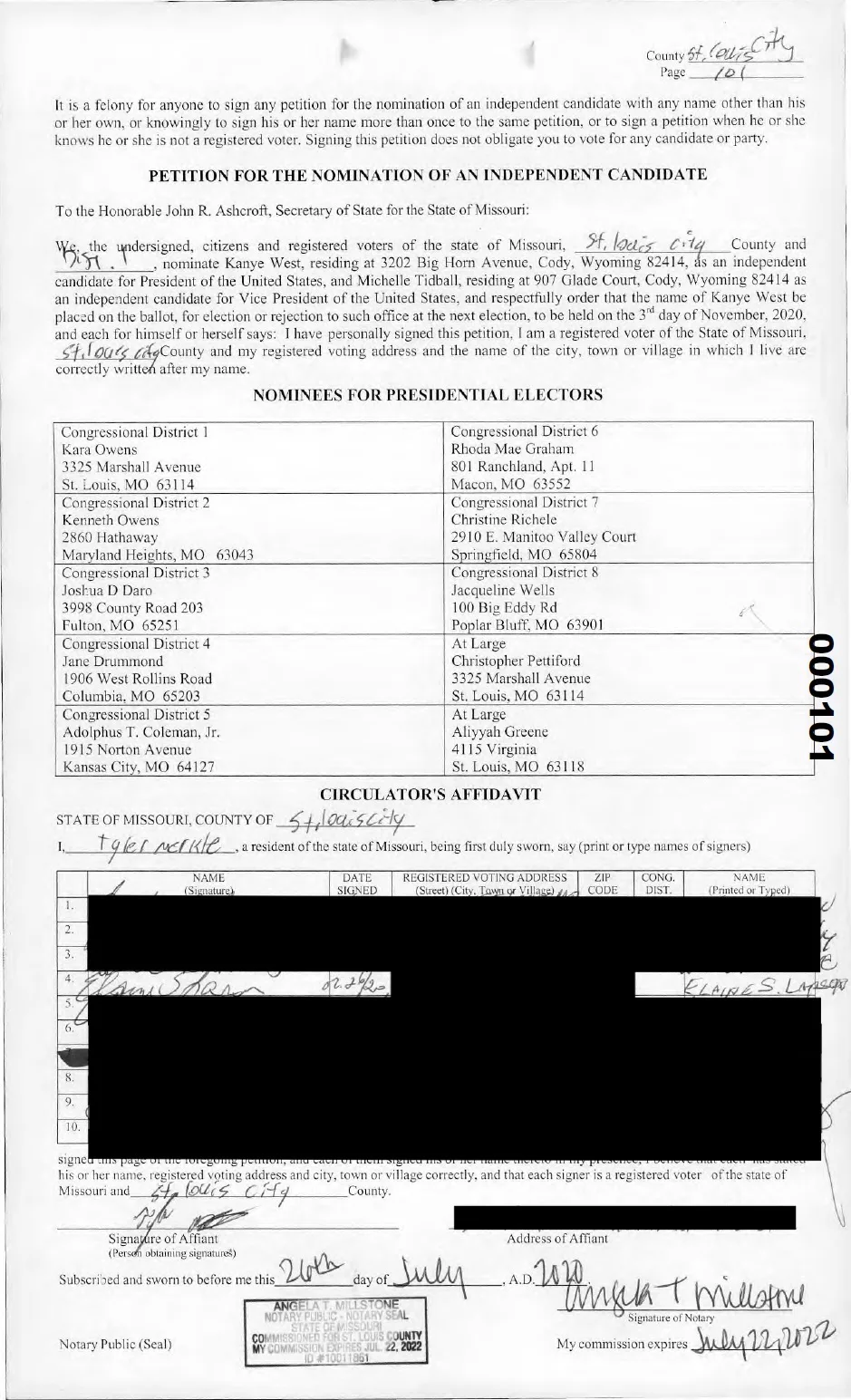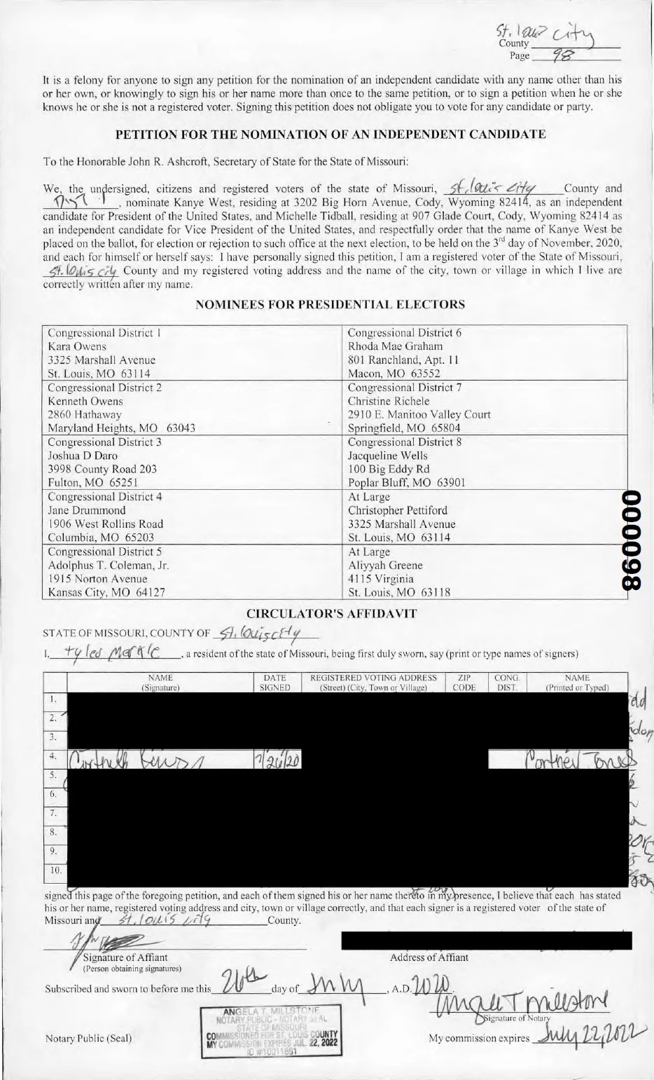 Jones filed a complaint with Ashcroft’s office on Aug. 7. “I feel bamboozled,” she says, “because it’s that easy to lie to get me to sign something for their preference. It really makes me feel angry, because it went against what I wanted. I am not for Kanye West for anything.” Jones claims that she couldn’t see the entire petition page when she signed it, either: “He had the papers flipped over and just had where you sign” visible for her to read, she says.