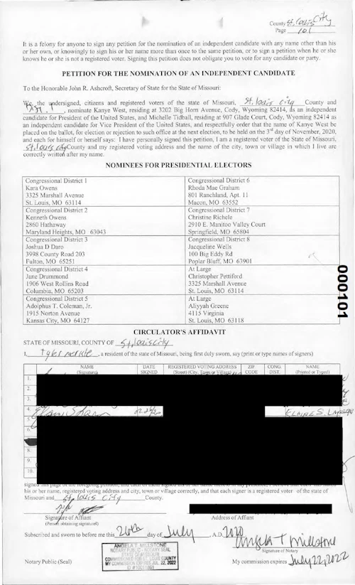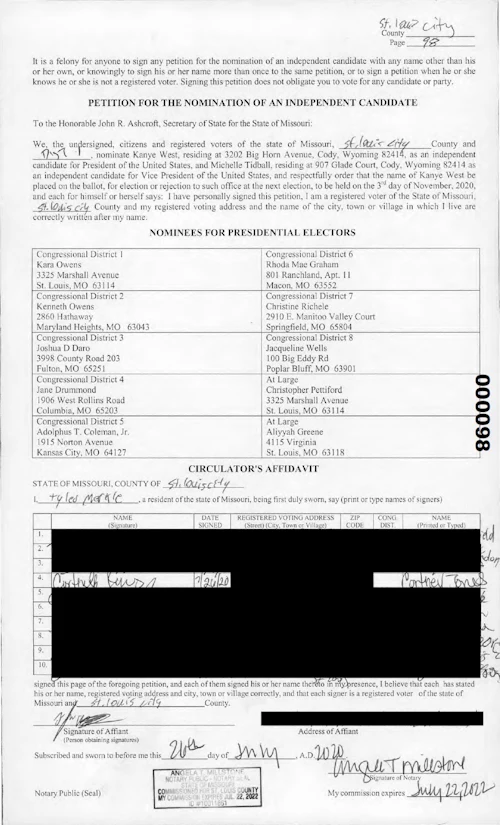 Another individual of interest in the Missouri operation is St. Louis-based GOP operative Gregg Keller, who publicly acknowledges his role as Kanye’s campaign adviser. Atlas Strategy Group, the consulting firm run by Keller, has been paid nearly $1.3 million, according to West’s overdue campaign finance report filed Sept. 4 with the Federal Elections Commission. He was listed as the point of contact for West’s campaign in the paperwork that was filed to get the rapper on the Arkansas ballot. He also reportedly helped coordinate the West campaign’s signature-gathering effort in Ohio, admitted to helping in Kentucky, and assisted his highly coordinated and allegedly deceptive ballot access effort in Arizona. Arizona and Kentucky are another two states where voters have alleged that they were asked to sign West’s campaign petitions but were told they were signing to keep him off the ballot.