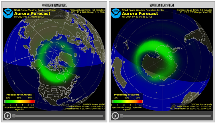 This animation of a green glow surrounding Earth’s poles gives a clear visual idea of where the aurora is likely to be strongest (usually on Earth’s night-time side).