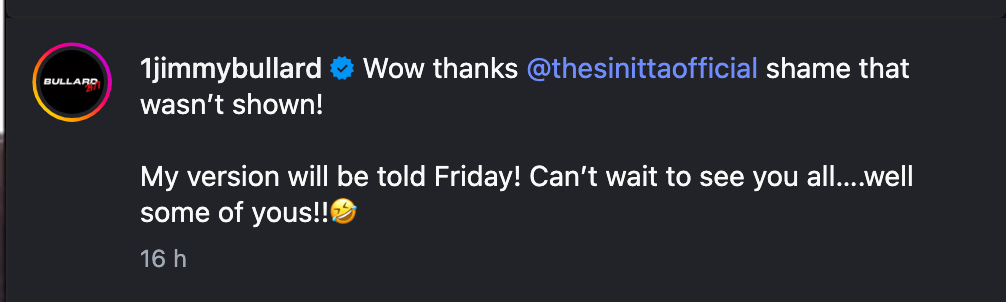 Bullard thanked Sinitta for her comment – and revealed he will share his own version of events at the reunion show on Friday (24 April). ”Wow thanks @thesinittaofficial shame that wasn't shown! My version will be told Friday! Can't wait to see you all….well some of yous!!” he wrote.