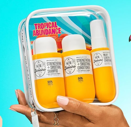 Having to buy special bottles for liquids in your carry-on bag can be a pain — just grab this hair care trio from Sol de Janeiro instead. It comes with shampoo, conditioner, as well as leave-in conditioner, all of which are formulated to help repair split ends, reduce breakage, as well prevent future breakage. Plus, the bottles and zippered travel case are approved for use by the TSA.