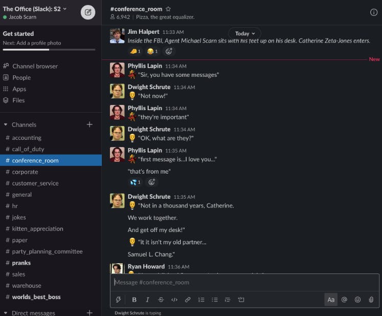 The Office Slack workspace has more than 8,000 members as I write this on Tuesday afternoon, up from a little over 3,000 at the end of Monday (episodes run from 9 a.m. to 5 p.m. Eastern, just like a normal office). I find myself constantly switching back and forth between my own work Slack and The Office, terrified I'll miss something fun. (At this moment, Jim is leading his co-workers in a reading of Michael's infamous movie script, Threat Level Midnight.)