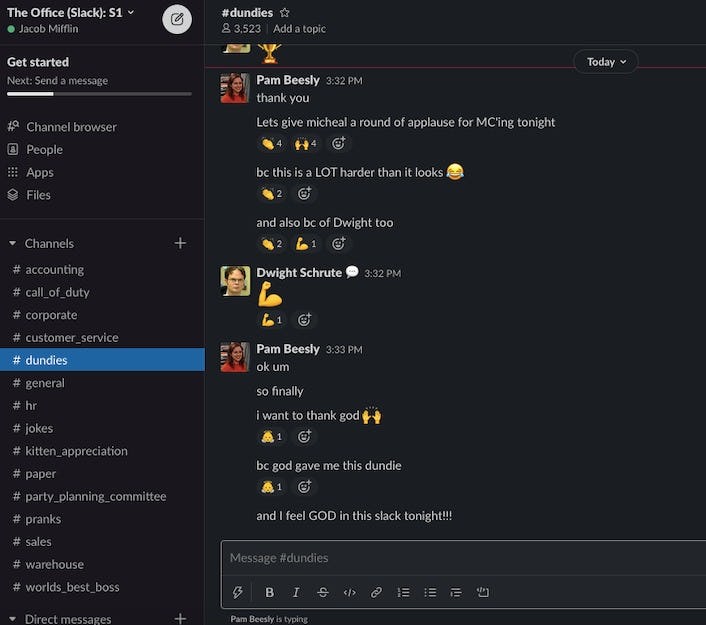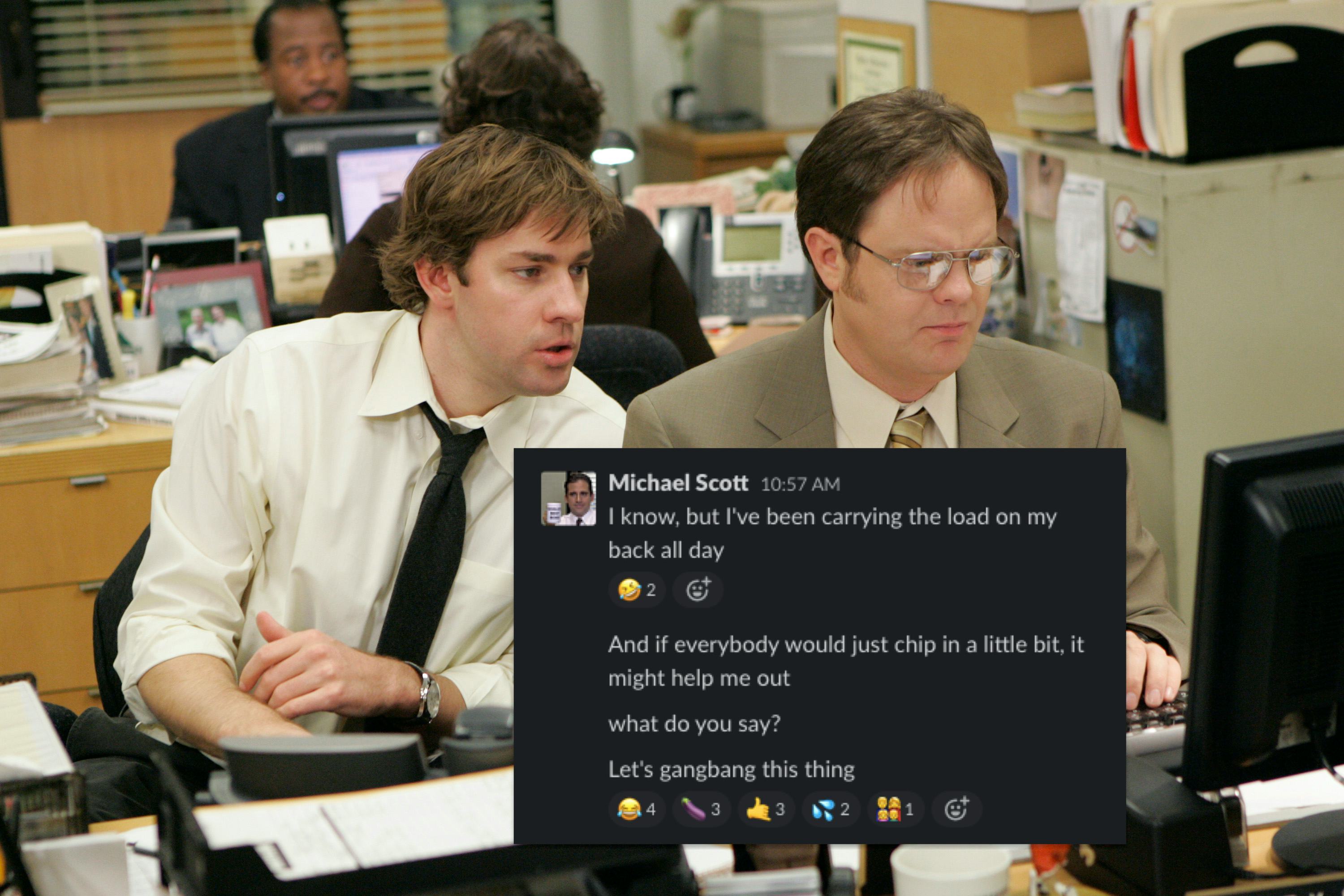In a way, this Slack approximation feels more realistic than The Office ever did. Most workplaces aren't punctuated with daily pranks, fake fire drills, and karate demonstrations, but on Slack, we're all given a bit more freedom to express ourselves with absurd GIFs and custom emoji.