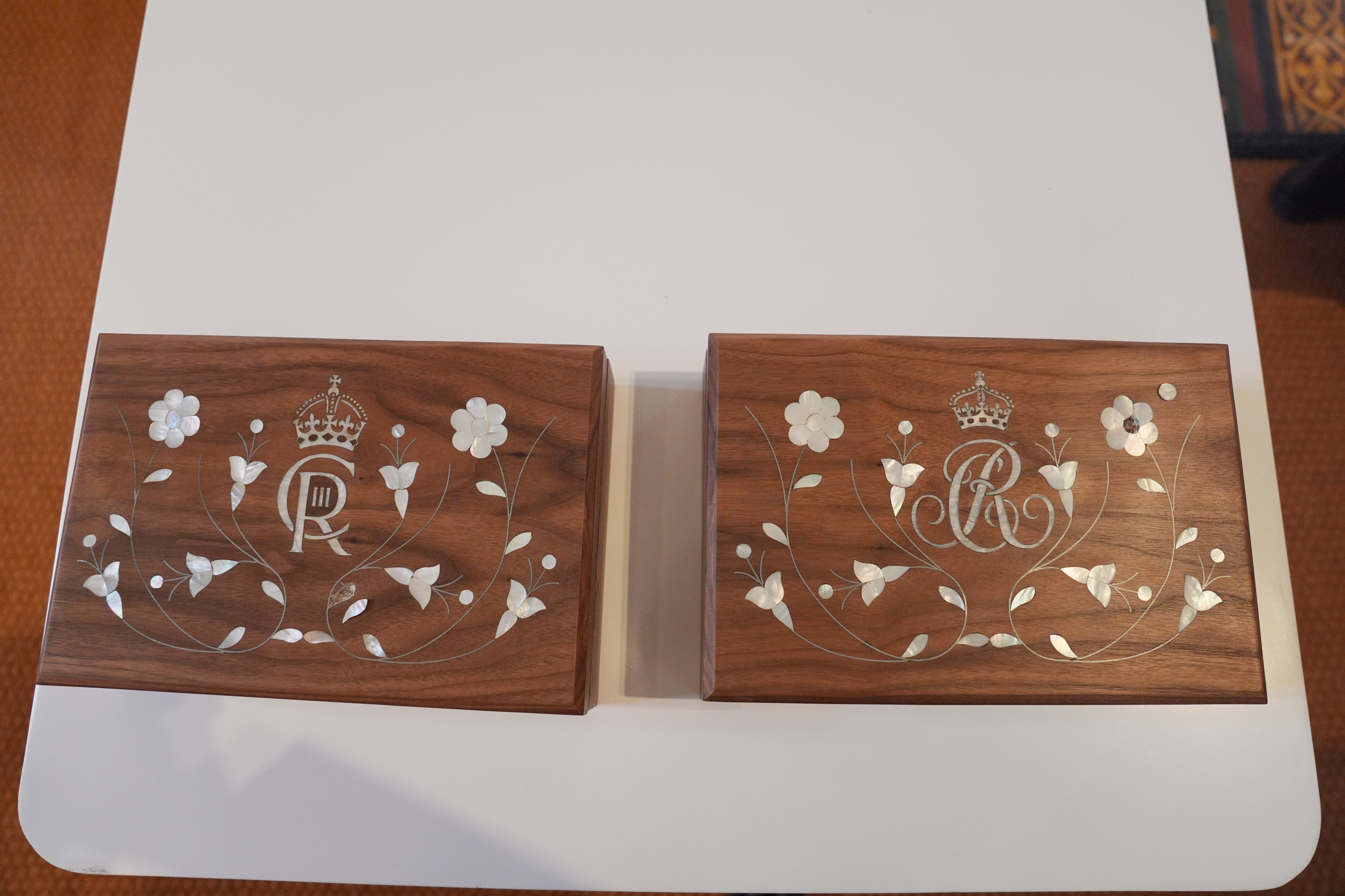 Charles and Camilla were invited to apply the finishing touches by placing the final pieces of mother of pearl onto their respective boxes.