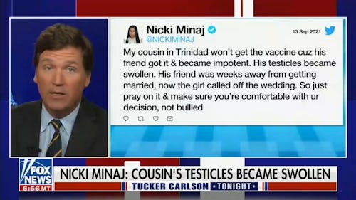 The testicles in question, raised by the megastar rapper in an ill-advised series of (deeply misinformed) anti-COVID vaccine tweets this week, have taken on something of a life of their own, inspiring memes, governmental denials, and — to my unending personal delight — an ongoing segment on Tucker Carlson's eponymous weeknight Fox News show. For as funny as Minaj's insistence that getting a COVID shot blew her cousin's friend's balls up to gargantuan proportions is (and boy is it!), the fact that Carlson has spent multiple programs discussing the alleged instance of huge ball-ism has kicked this whole thing up into my personal comedy hall of fame.