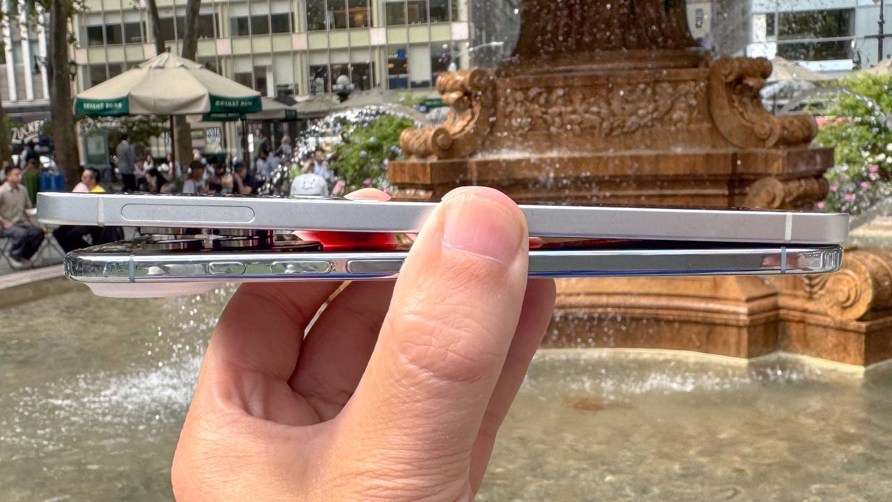 However, the Galaxy S25 Edge is a bit lighter at 5.75 ounces vs 5.82 ounces for the iPhone Air. Both phones will easily slip in a front pocket and they're so light and thin you may forget that they're even there — which is the point.