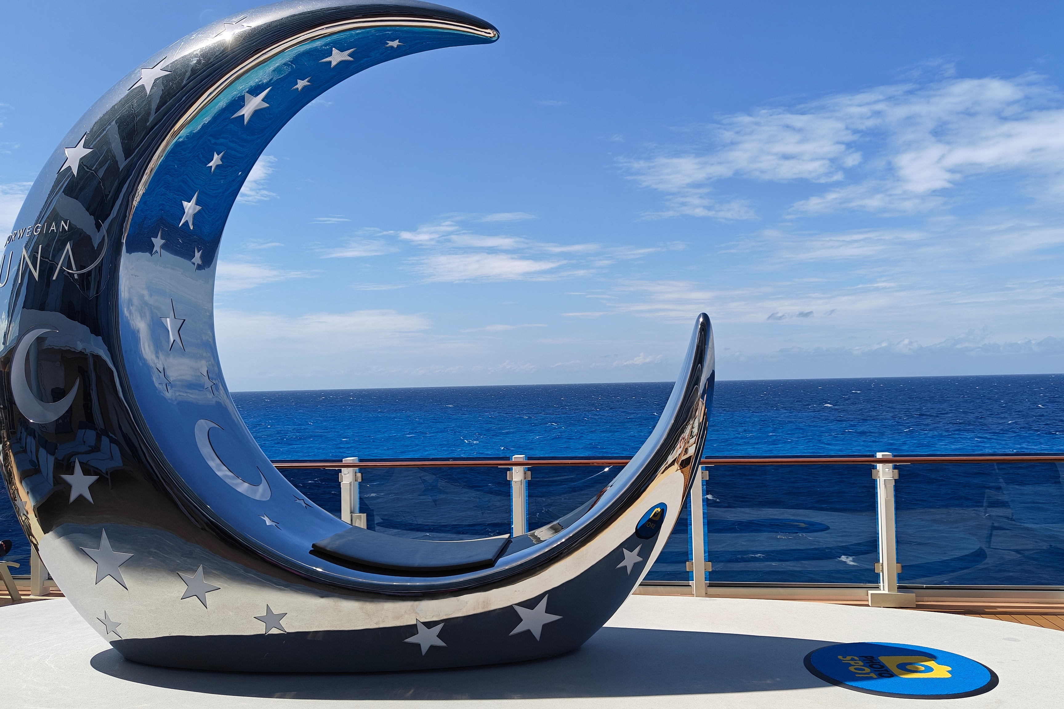 The moon has even been brought on board. A giant silver crescent greets us as we explore the Ocean Boulevard, which wraps around deck eight: a perfect spot for a photograph.