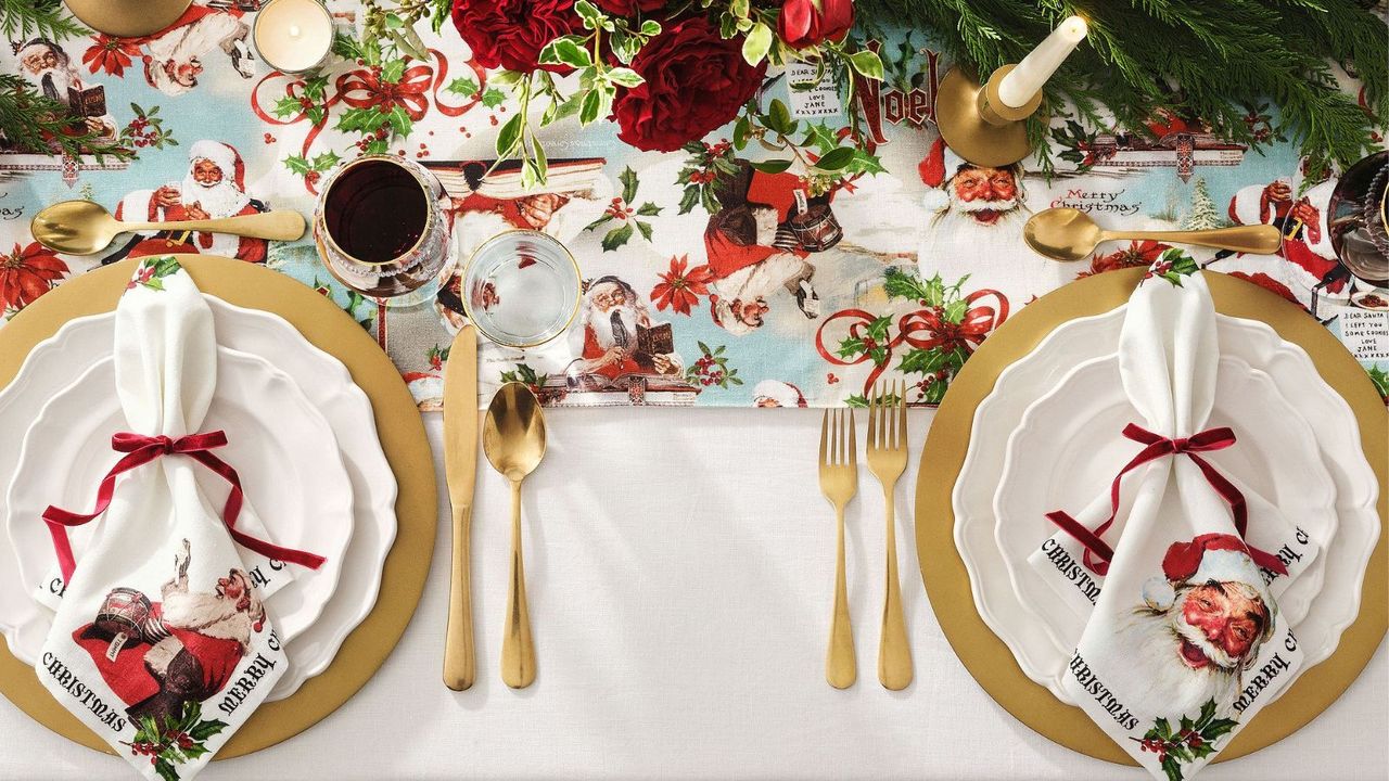 The first piece I spotted was the Norman Rockwell table runner, which is a riot of festive slogans, mistletoe motifs and Santa prints. Naturally, it pairs perfectly with the Norman Rockwell napkin set for a cheerful, yet refined look.