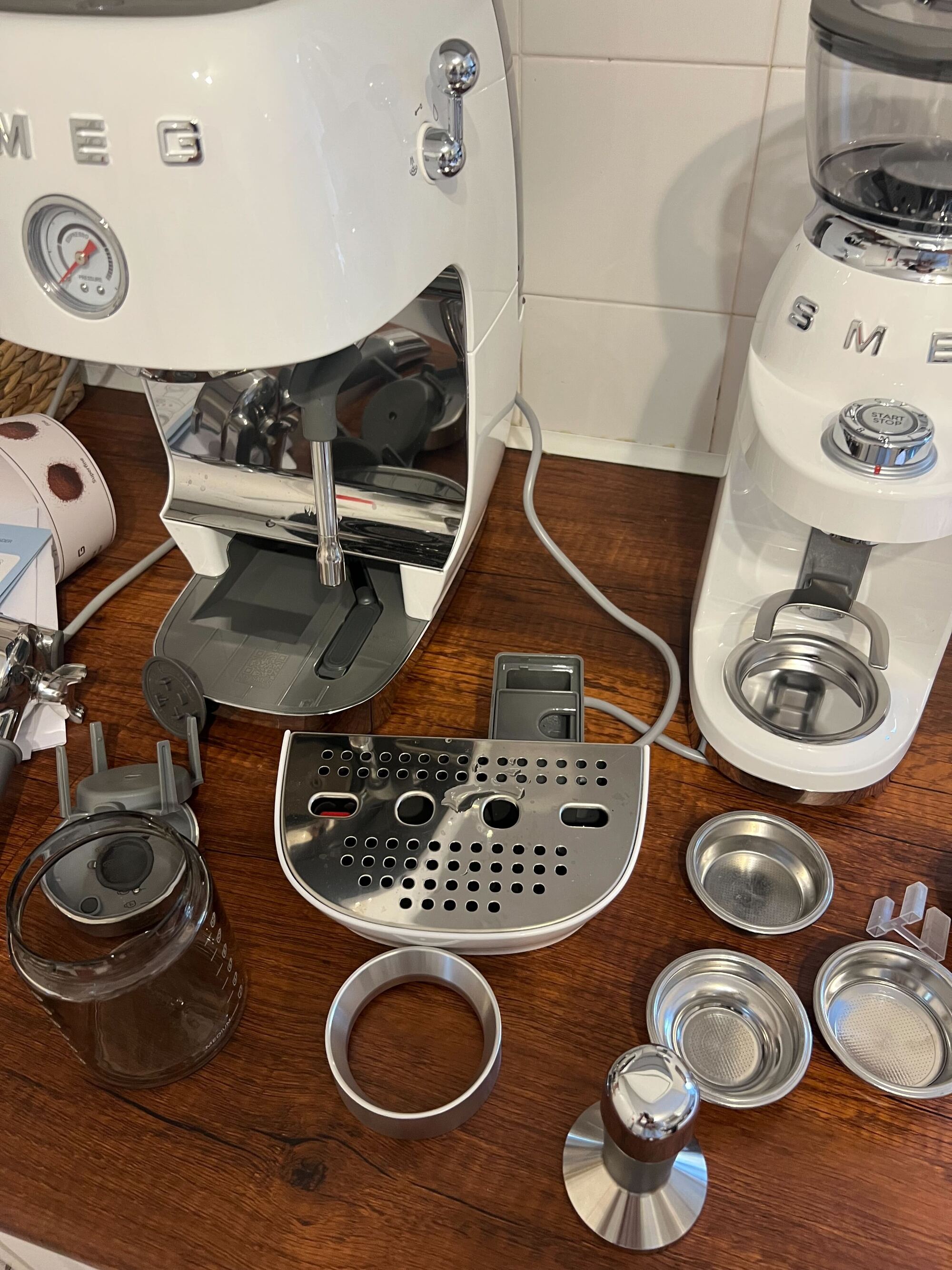 Now, the Smeg cold brew coffee machine doesn't come with many extra coffee accessories. You have your portafiller, varying filter baskets, and tamper; it's the essentials, but no flourish. More notably, there is no built-in grinder — an element that you would have with other semi-automatic machines, such as the Kitchenaid semi-automatic espresso maker.