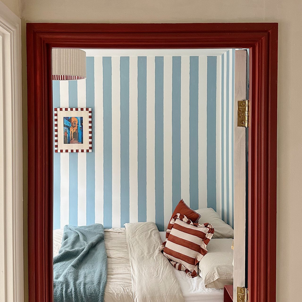 Or Tahira’s place, at the top the page. She runs the instagram account @tahirashome, and she’s got this deep red doorframe, which you can see from the hallway. Then, right as you enter the next room with its beautiful blue stripey wallpaper - bam! - a picture frame in that exact same deep red. She also added a pretty cushion repeating that colour. It’s so simple, but it makes everything feel intentional.