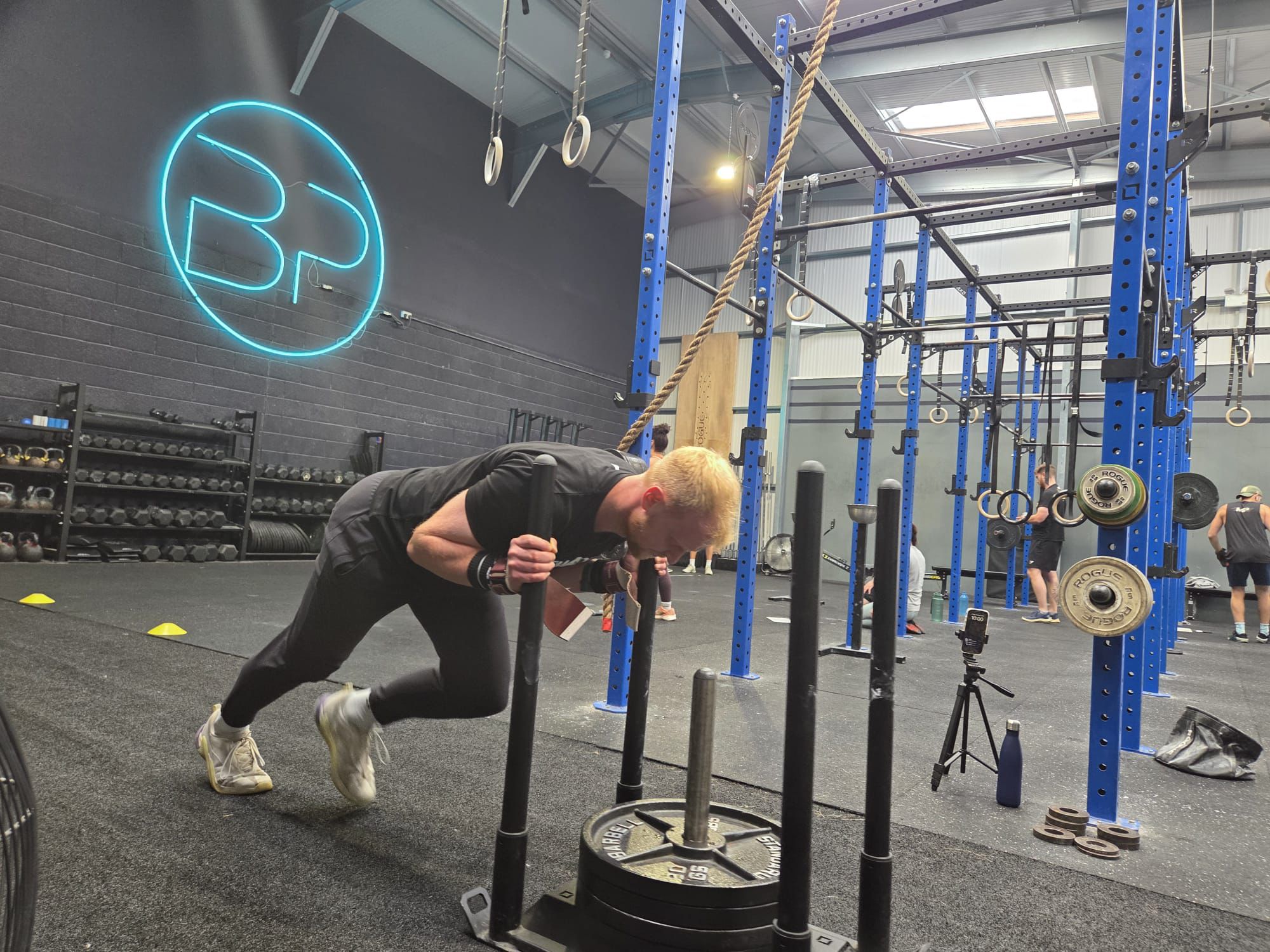 I manage another two muscle-ups in my next set, but my fatigued shoulders cause my form to fall apart. The final rep comes a few seconds later, but by this time Cringle is well into her sled push – my goal of not being lapped is quickly fading away.