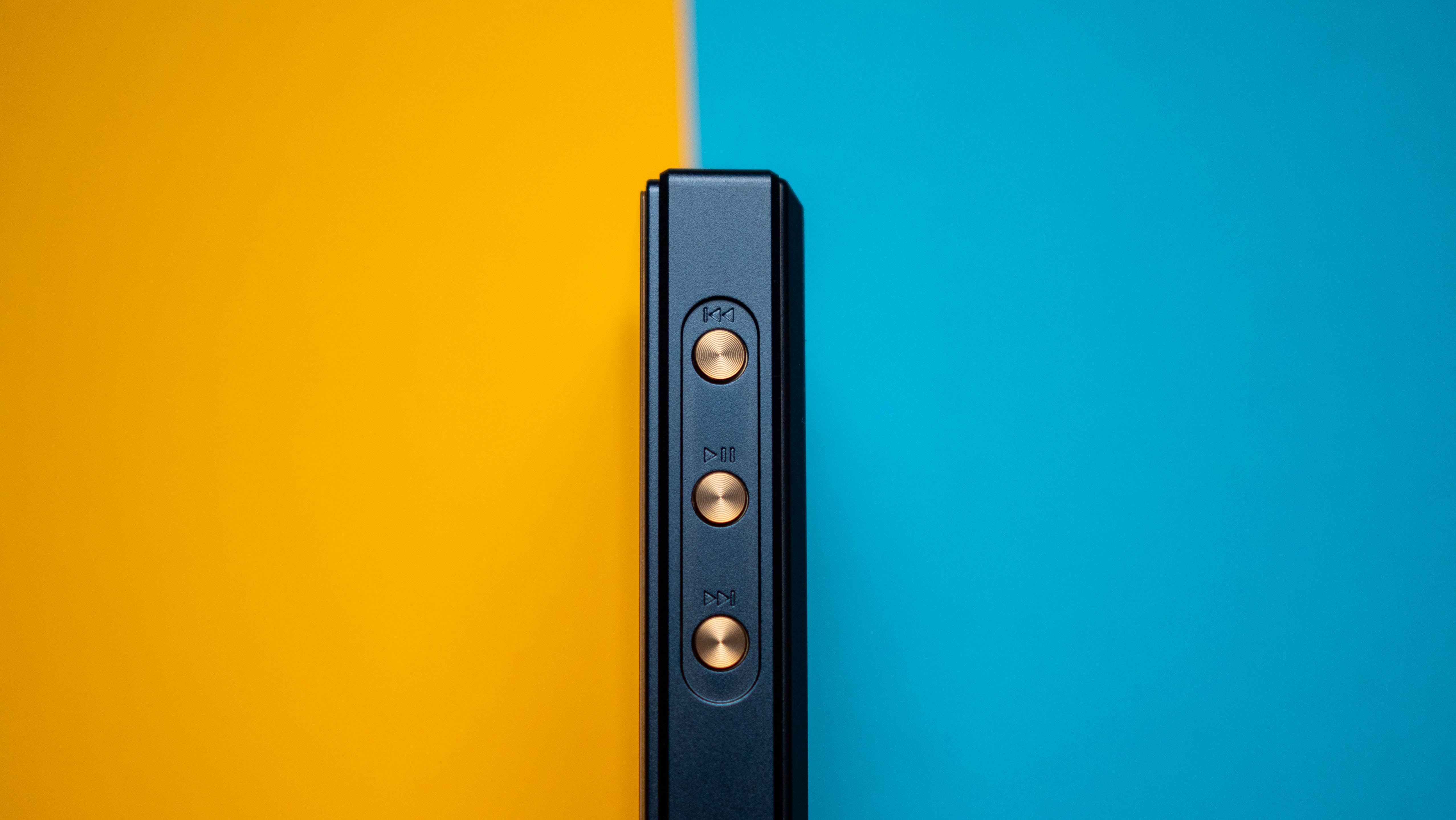 I like that the buttons are accented in gold; this differentiates the design a little bit, providing a nice contrast to the blue hue of the device itself. The M21 gets a single-ended 3.5mm port alongside a balance 4.4mm out, and you get USB-C connectivity in addition to a dedicated USB-C port that solely draws power. This is useful because the M21 has a desktop mode, allowing you to bypass its internal battery and solely use USB power.