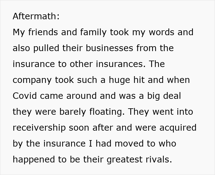 The result? The disgustingly rude and smug insurance company quickly went out of business, getting bought up by its biggest rivals. The cherry on the cake was that the author of the viral post ended up buying the building where the offending insurers had been operating.