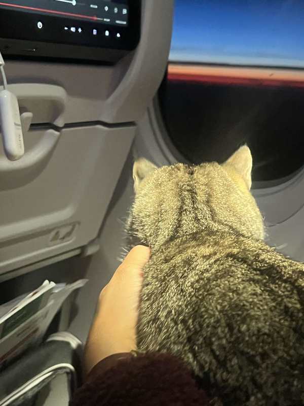 Fortunately, this particular cat was very well behaved and sat in the traveler's lap looking out into the setting sun without causing any issues. I asked to pet it (there is something about seeing furry pets just brings out that human "have to cuddle it" instinct) and sat smiling quietly at the passenger's audacity before a flight attendant making the rounds passed through and did the same double-take that I did when the pet first came out.