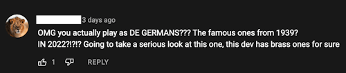 This is not lost on many of these videos’ commenters, however. “Very refreshing to play as the based side for once,” one user wrote, with another person directly replying with “We defeated the wrong enemy.” “I hope this game works out,” yet another commenter named “[Pure Blood] Anglo Christian” posted elsewhere, “I’ve been wanting to play a game where the Germans are actually the protagonists.”