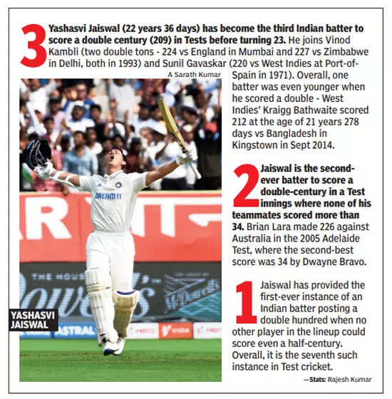 NEW DELHI: Young Indian opener Yashasvi Jaiswal stole the spotlight on the second day of the second Test against England, delivering a spectacular double hundred. Jaiswal's maiden double century, scoring 209 in 290 balls with 19 fours and seven sixes, was the highlight of the day.