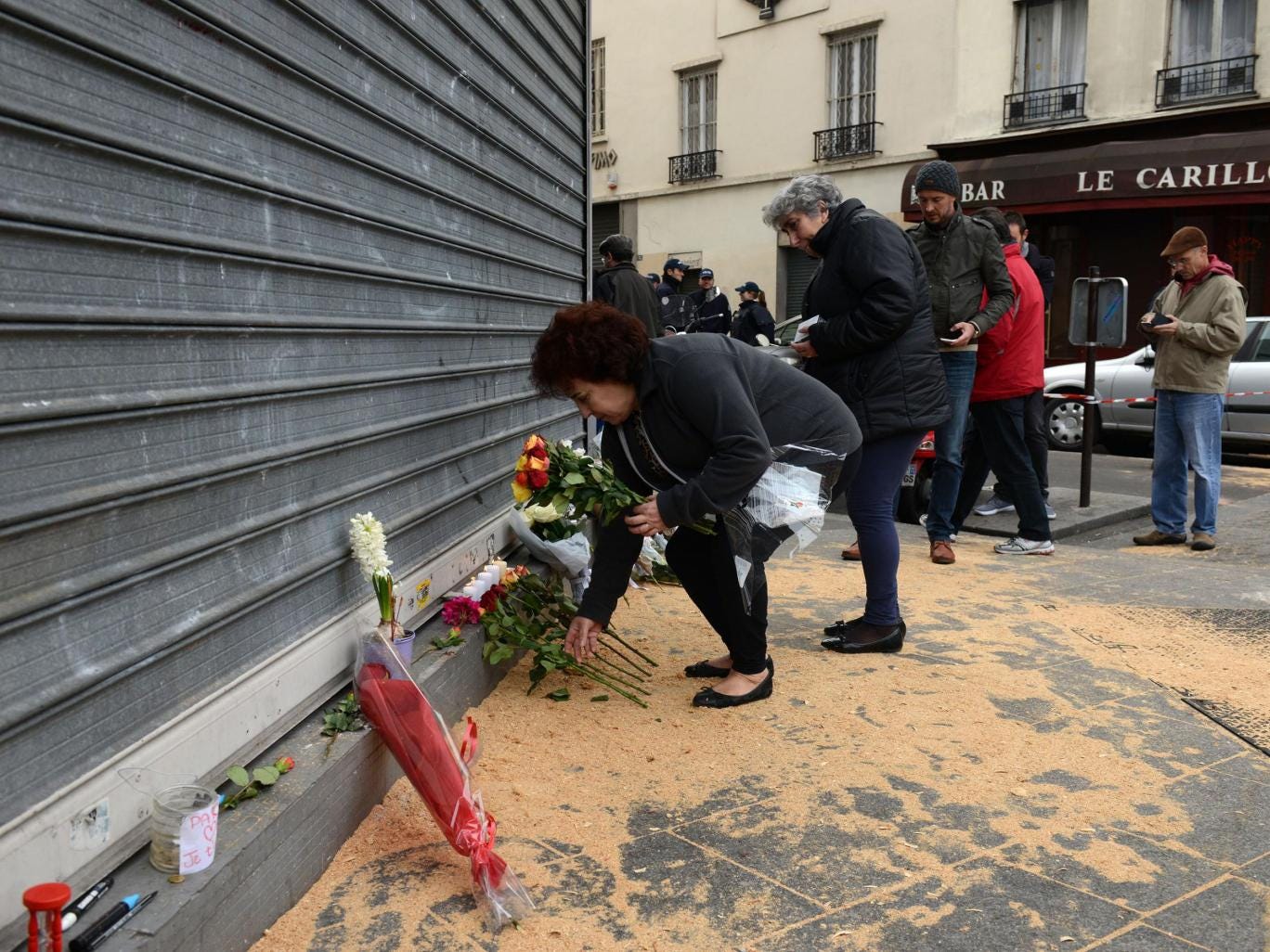 My only option was to walk down Rue Bichet, where at the end on each corner are Le Carillon and Le Petit Cabodge, the bar and restaurant that gunmen had opened fire in last night. All seemed normal along the street, with cafes opening up and prepping for the day, until I reached the end where a crowd of mourners had gathered outside the establishments, laying flowers and candles in front of the bullet riddled windows and fronts.