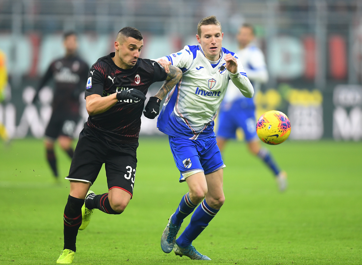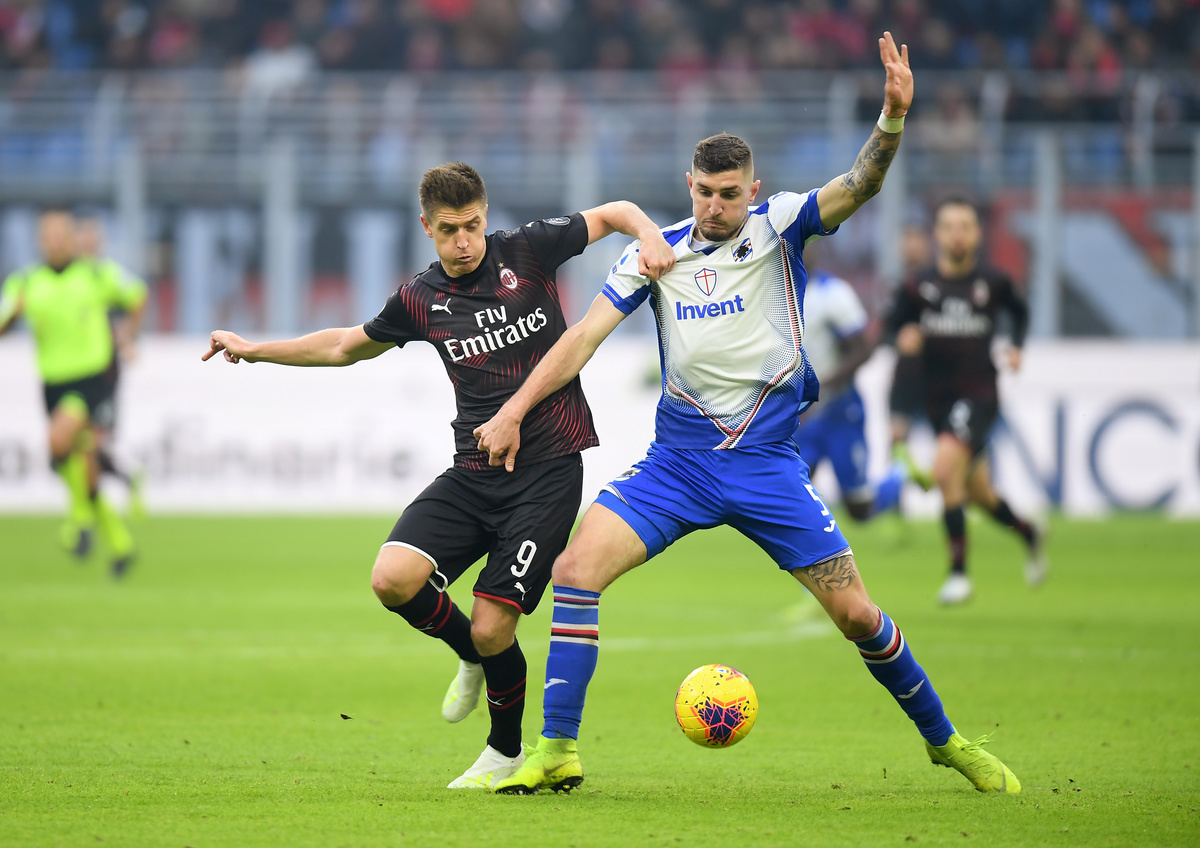 Soccer Football - Serie A - AC Milan v Sampdoria - San Siro, Milan, Italy - January 6, 2020 AC Milan's Krzysztof Piatek in action with Sampdoria's Julian Chabot REUTERS/Daniele Mascolo
