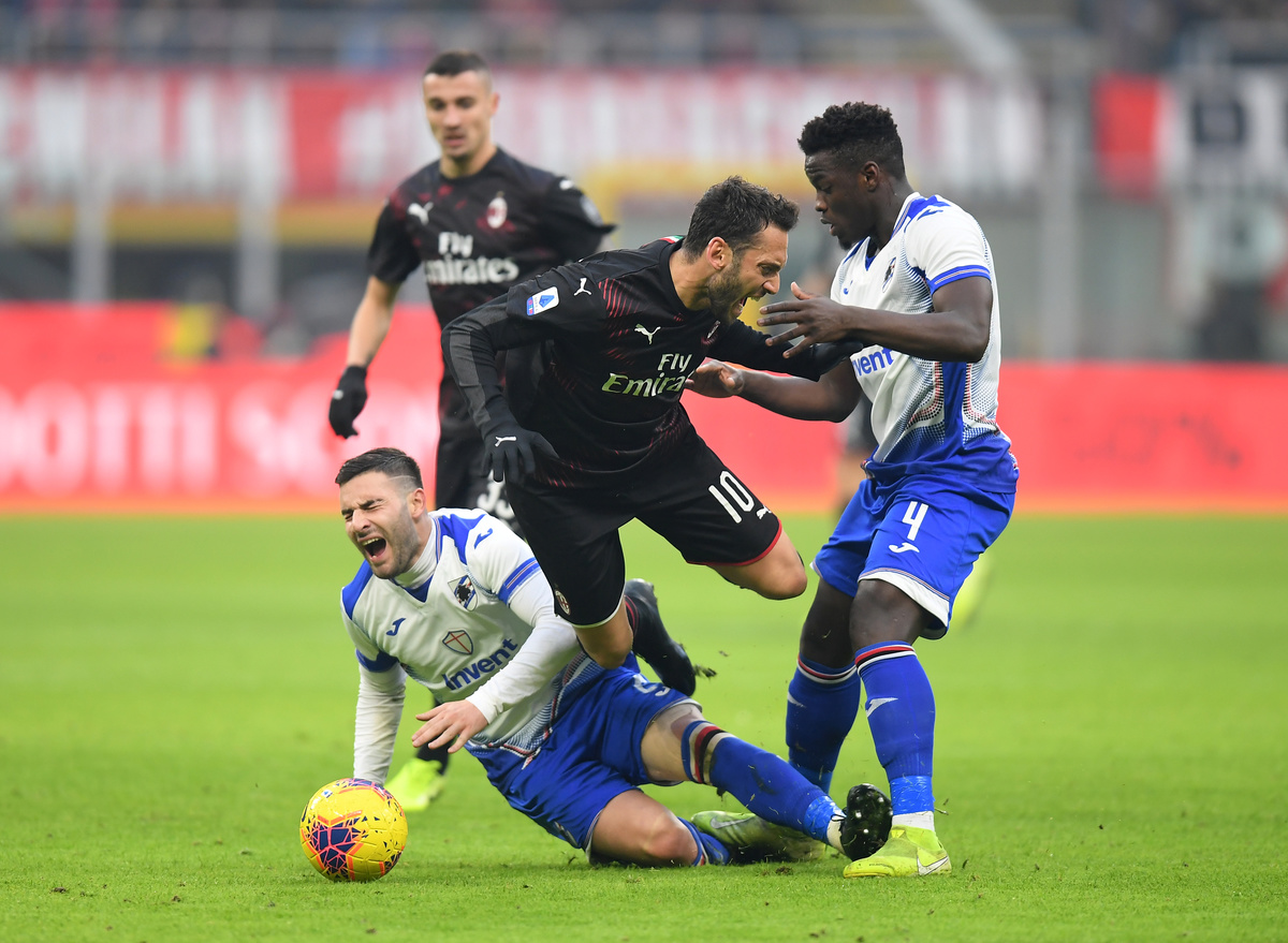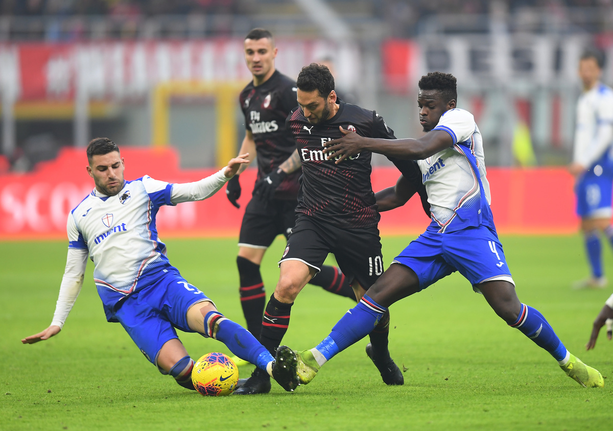 Soccer Football - Serie A - AC Milan v Sampdoria - San Siro, Milan, Italy - January 6, 2020 Sampdoria's Nicola Murru and Ronaldo Vieira in action with AC Milan's Hakan Calhanoglu REUTERS/Daniele Mascolo