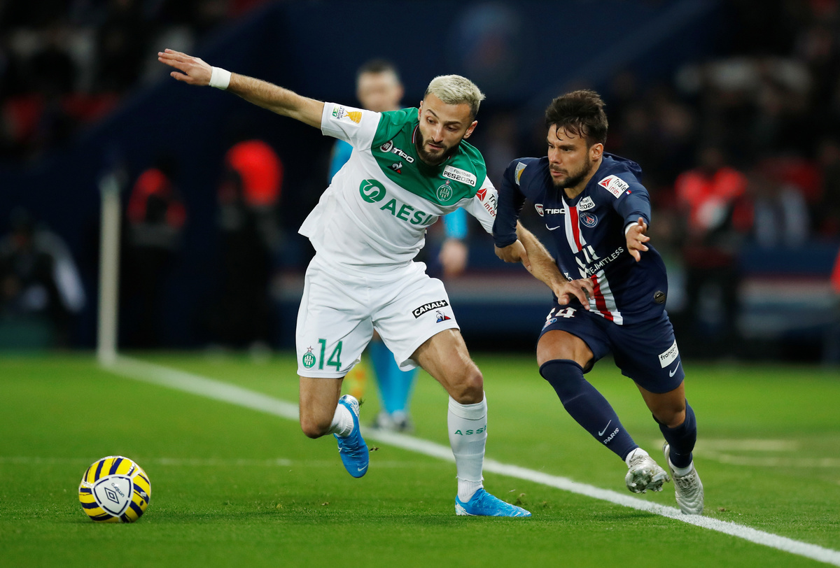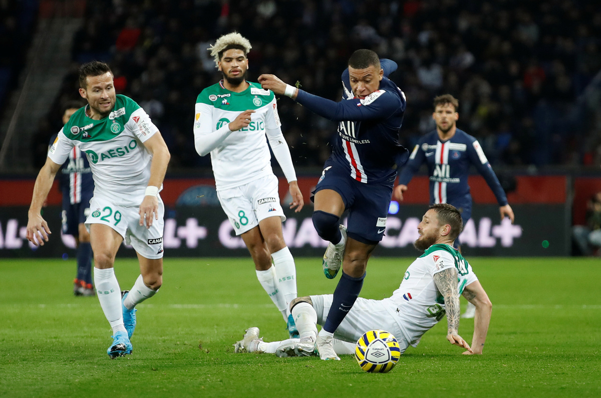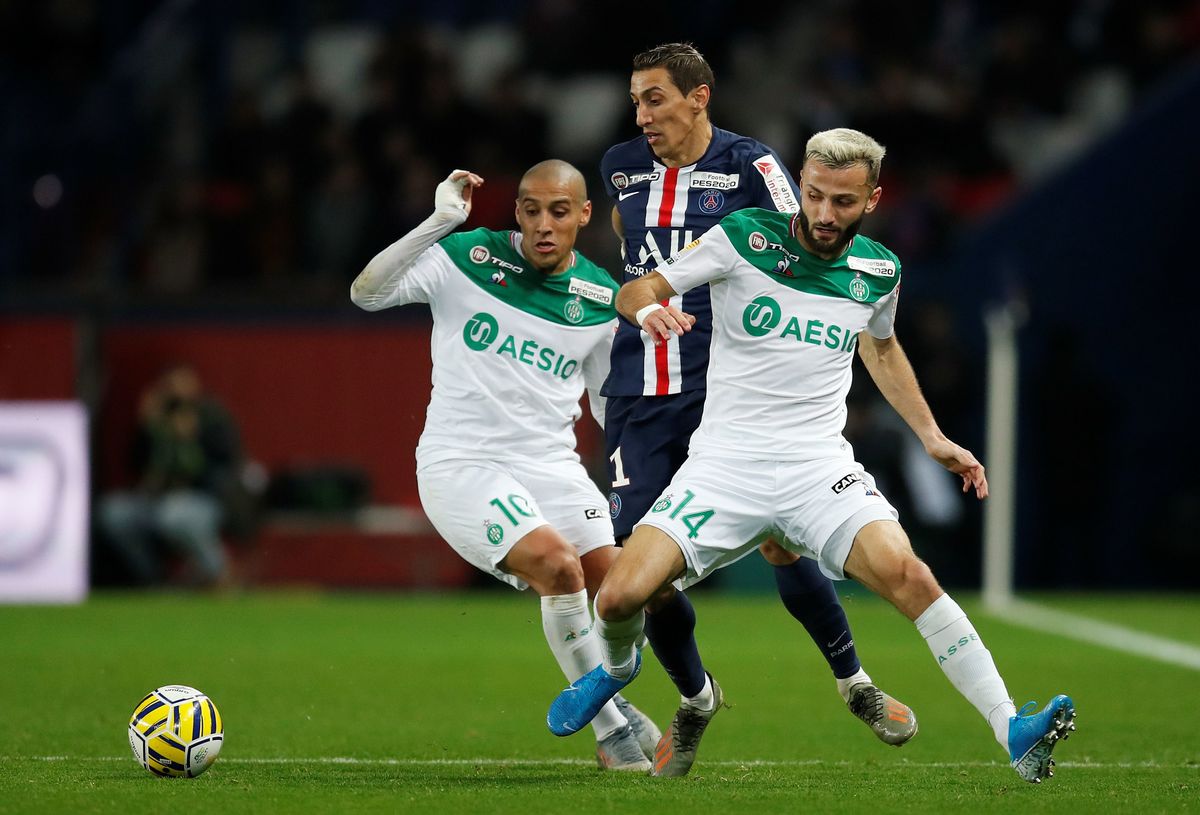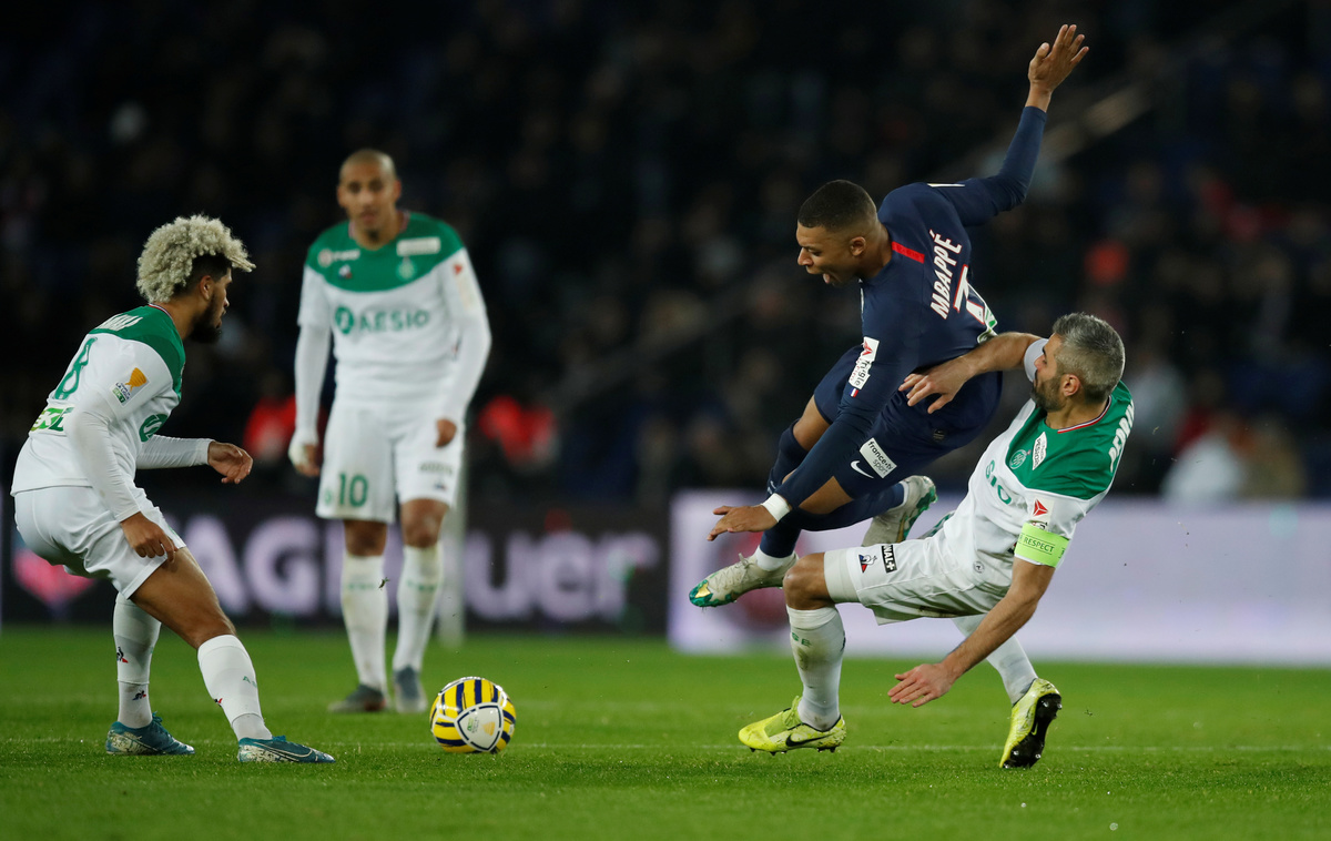 Soccer Football - Coupe de la Ligue - Quarter Final - Paris St Germain v Saint-Etienne - Parc des Princes, Paris, France - January 8, 2020 Paris St Germain's Kylian Mbappe in action with Saint Etienne's Loic Perrin REUTERS/Gonzalo FuentesSoccer Football - Coupe de la Ligue - Quarter Final - Paris St Germain v Saint-Etienne - Parc des Princes, Paris, France - January 8, 2020 Paris St Germain's Angel Di Maria in action with Saint Etienne's Franck Honorat and Wahbi Khazri REUTERS/Gonzalo Fuentes
