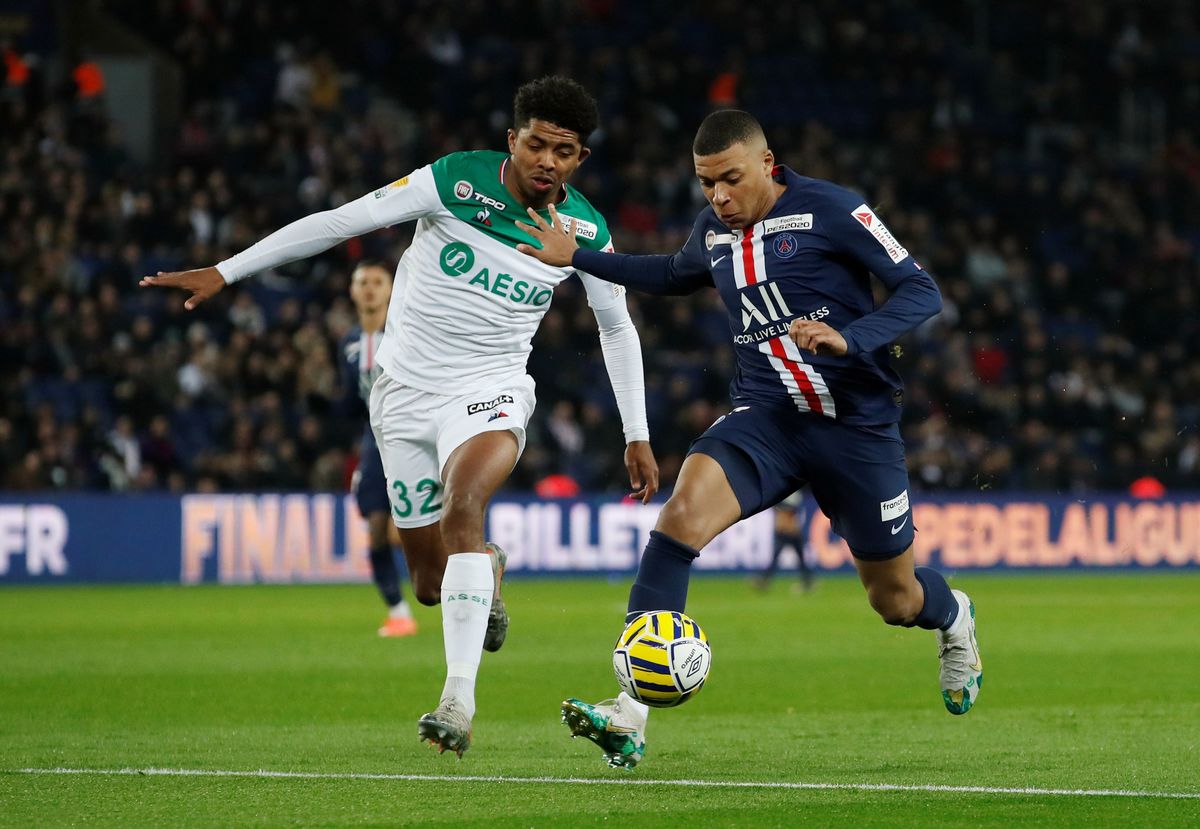 Soccer Football - Coupe de la Ligue - Quarter Final - Paris St Germain v Saint-Etienne - Parc des Princes, Paris, France - January 8, 2020 Paris St Germain's Kylian Mbappe in action with Saint Etienne's Jessy Moulin before Paris St Germain's Edinson Cavani scored a goal that was later disallowed REUTERS/Gonzalo Fuentes