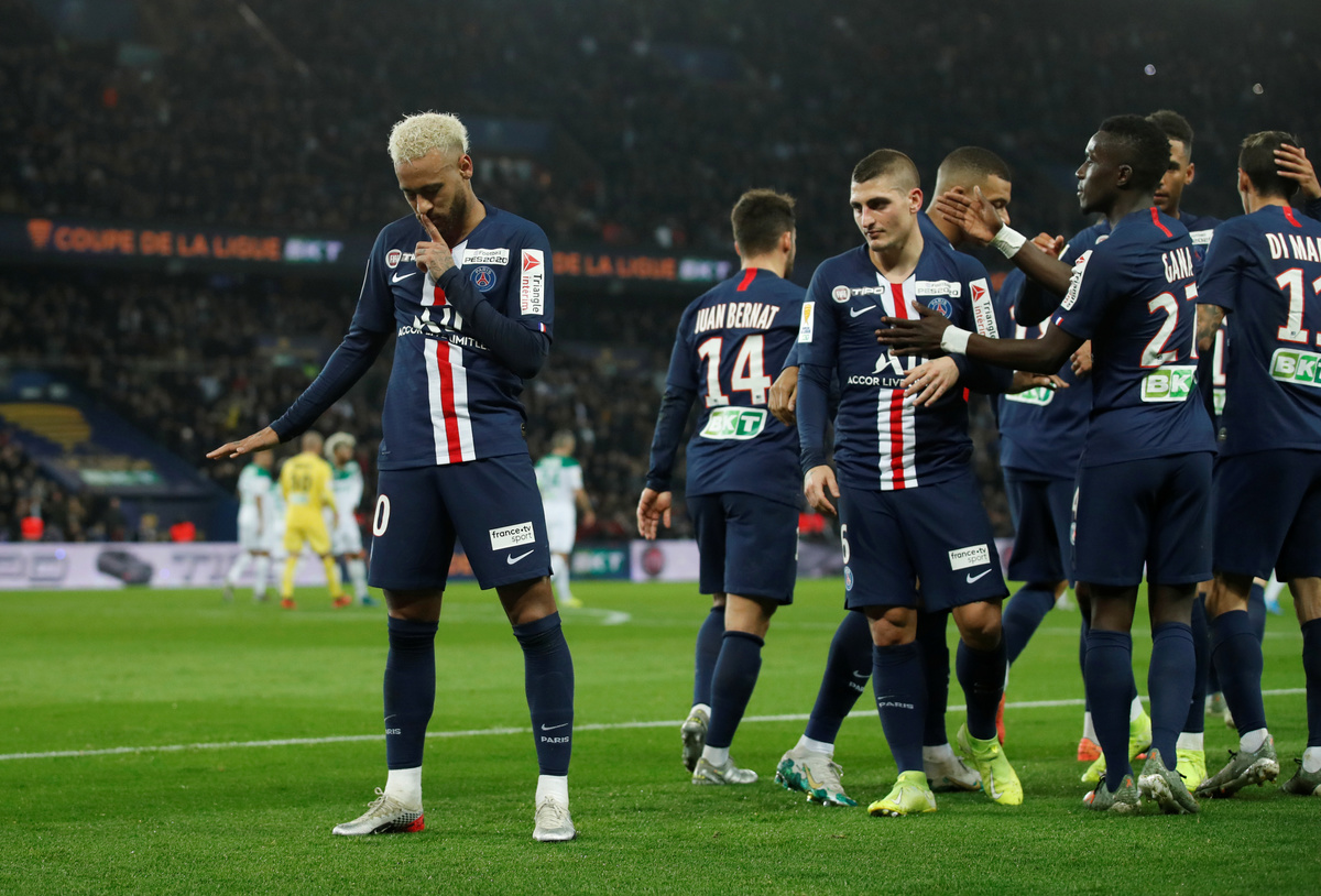 Soccer Football - Coupe de la Ligue - Quarter Final - Paris St Germain v Saint-Etienne - Parc des Princes, Paris, France - January 8, 2020 Paris St Germain's Neymar celebrates scoring their second goal with teammates REUTERS/Gonzalo FuentesSoccer Football - Coupe de la Ligue - Quarter Final - Paris St Germain v Saint-Etienne - Parc des Princes, Paris, France - January 8, 2020 Paris St Germain's Kylian Mbappe in action with Saint Etienne's Wesley Fofana REUTERS/Gonzalo FuentesSoccer Football - Coupe de la Ligue - Quarter Final - Paris St Germain v Saint-Etienne - Parc des Princes, Paris, France - January 8, 2020 Paris St Germain's Juan Bernat in action with Saint Etienne's Franck Honorat REUTERS/Gonzalo Fuentes