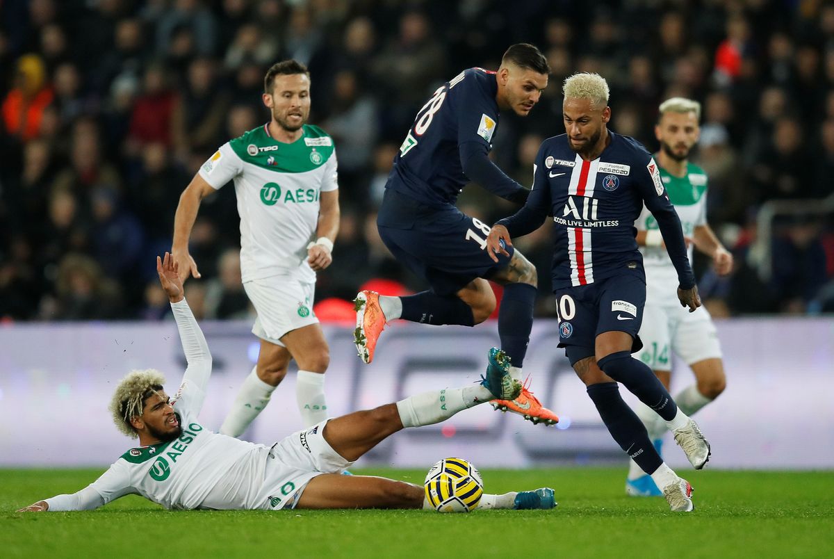 Soccer Football - Coupe de la Ligue - Quarter Final - Paris St Germain v Saint-Etienne - Parc des Princes, Paris, France - January 8, 2020 Paris St Germain's Mauro Icardi and Neymar in action with Saint Etienne's Mahdi Camara REUTERS/Gonzalo Fuentes