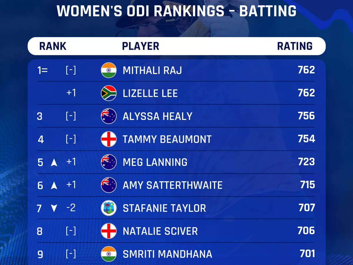 While Mithali, who retains her number one spot, is now tied in first place with Lee at 762 rating points, with Australia's Alyssa Healy in third place, India opener Smiriti Mandhana also held on to her ninth spot.