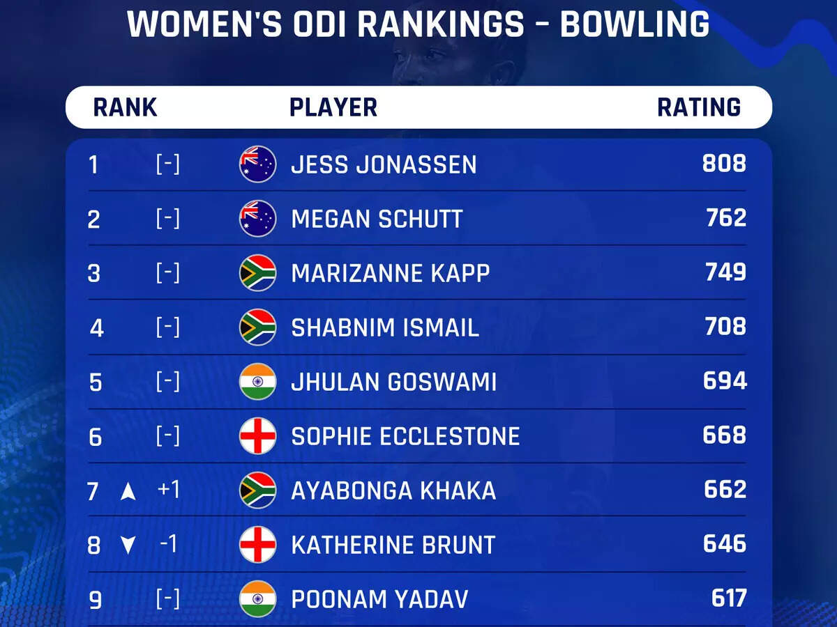 Veteran Indian pacer Jhulan Goswami and senior spinner Poonam Yadav remained static on fifth and ninth respectively among bowlers, while Deepti Sharma maintained her fifth spot in the all-rounders' list.