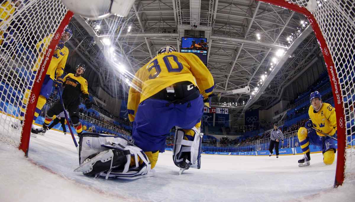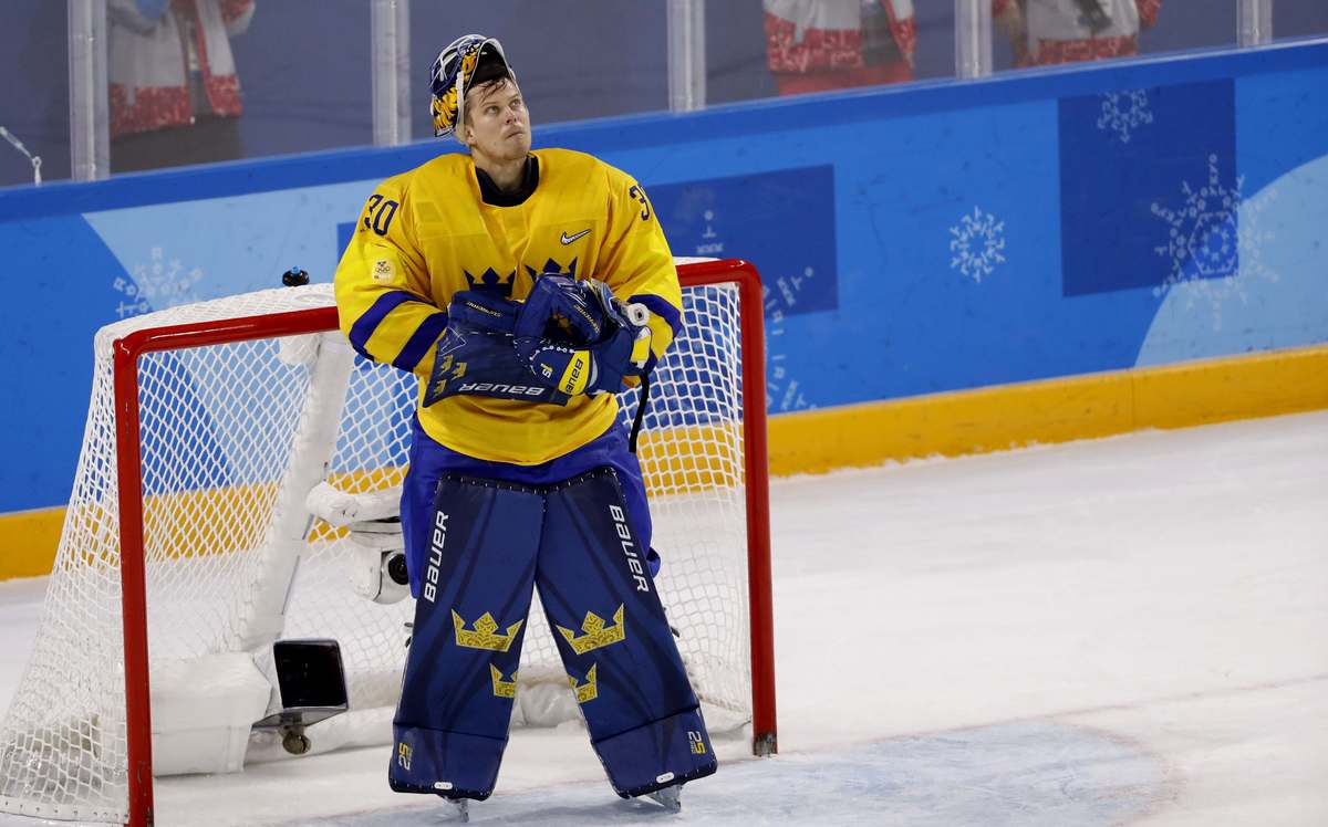 Ice Hockey - Pyeongchang 2018 Winter Olympics - Men's Quarterfinal Match - Sweden v Germany - Kwandong Hockey Centre, Gangneung, South Korea - February 21, 2018 - Viktor Fasth of Sweden looks dejected at the end of the match. REUTERS/Kim Kyung-Hoon
