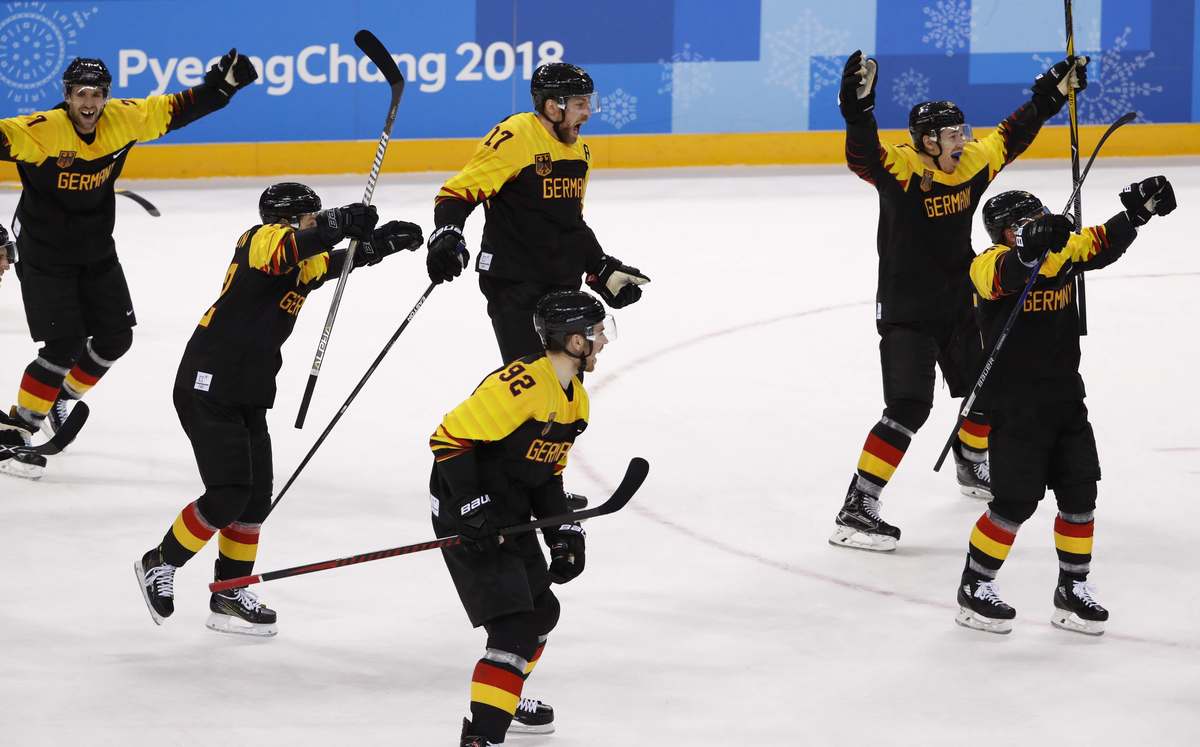 Ice Hockey - Pyeongchang 2018 Winter Olympics - Men's Quarterfinal Match - Sweden v Germany - Kwandong Hockey Centre, Gangneung, South Korea - February 21, 2018 - Germany players celebrate at the end of the match. REUTERS/Kim Kyung-Hoon