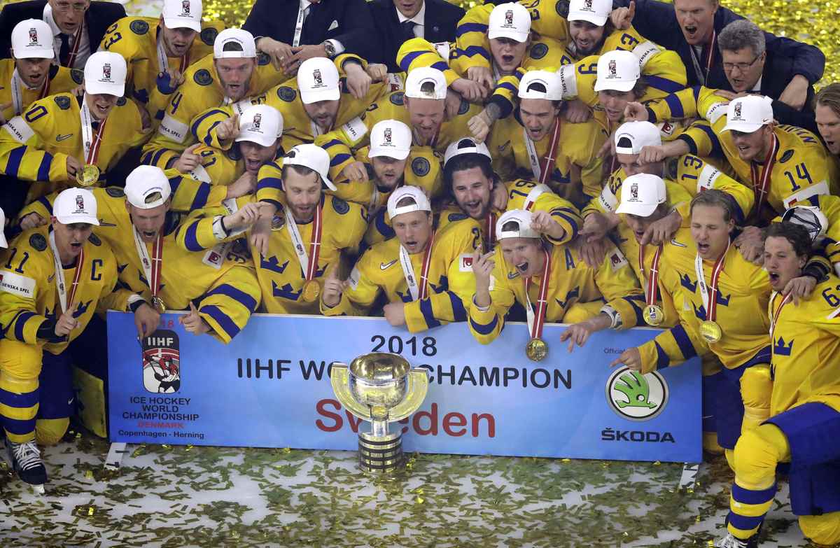 Ice Hockey - 2018 IIHF World Championships - Gold Medal Match - Sweden v Switzerland - Royal Arena - Copenhagen, Denmark - May 20, 2018 - Team Sweden celebrate after winning the gold medal.