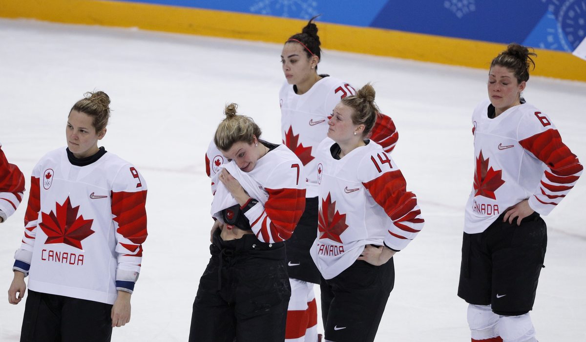 Ice Hockey - Pyeongchang 2018 Winter Olympics - Women's Gold Medal Final Match - Canada v USA - Gangneung Hockey Centre, Gangneung, South Korea - February 22, 2018 - Team Canada players react at the end of the game. REUTERS/Brian Snyder
