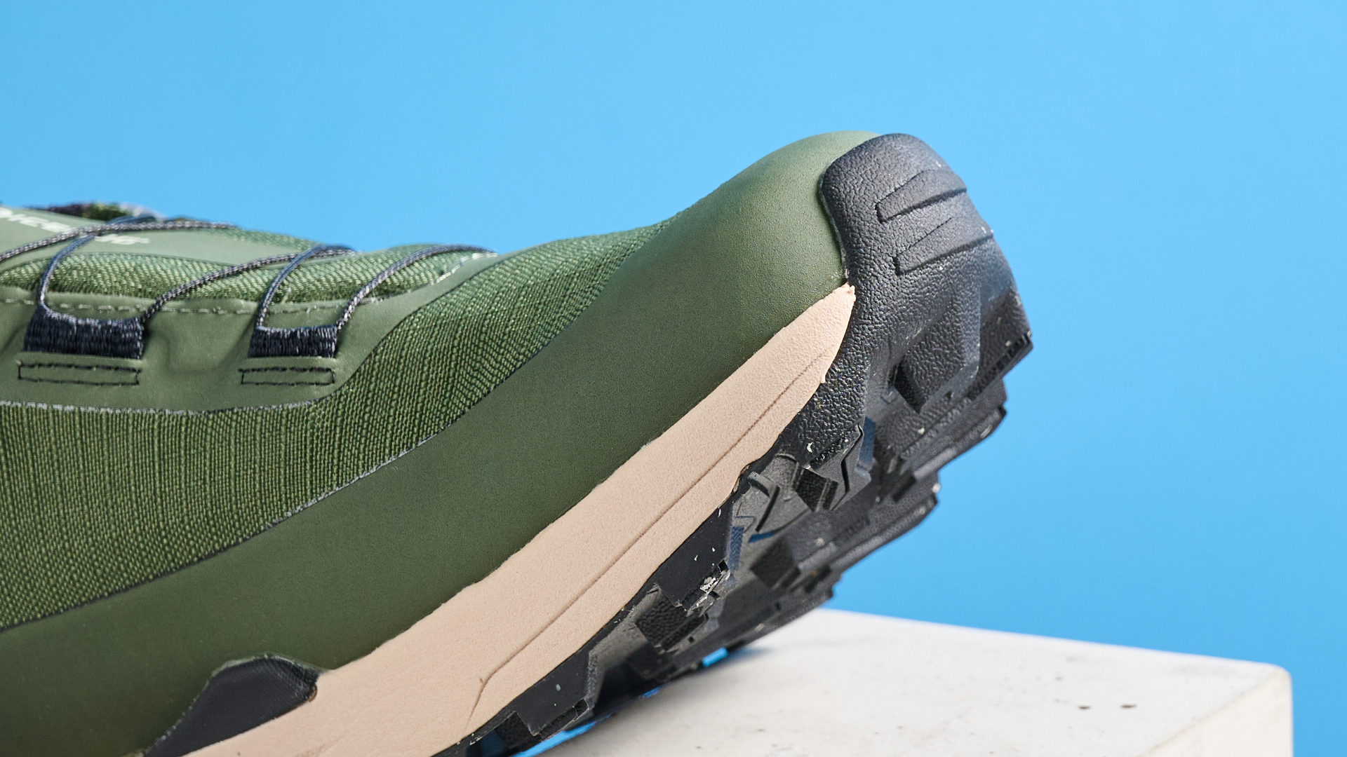 The inner heel and toe reinforcements of the shoe are 60% recycled plastic, and 11-12% of that is from recycled nylon fishing nets. These elements are very sturdy, and I could feel how tough they were on the rugged terrain I was encountering during testing.