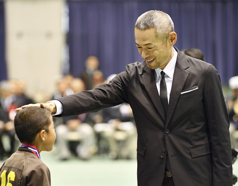The top three of the 180 teams that participated in the tournament were presented with awards at the ceremony. One by one, Ichiro put a medal around the necks of the three teams' members.
